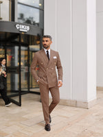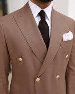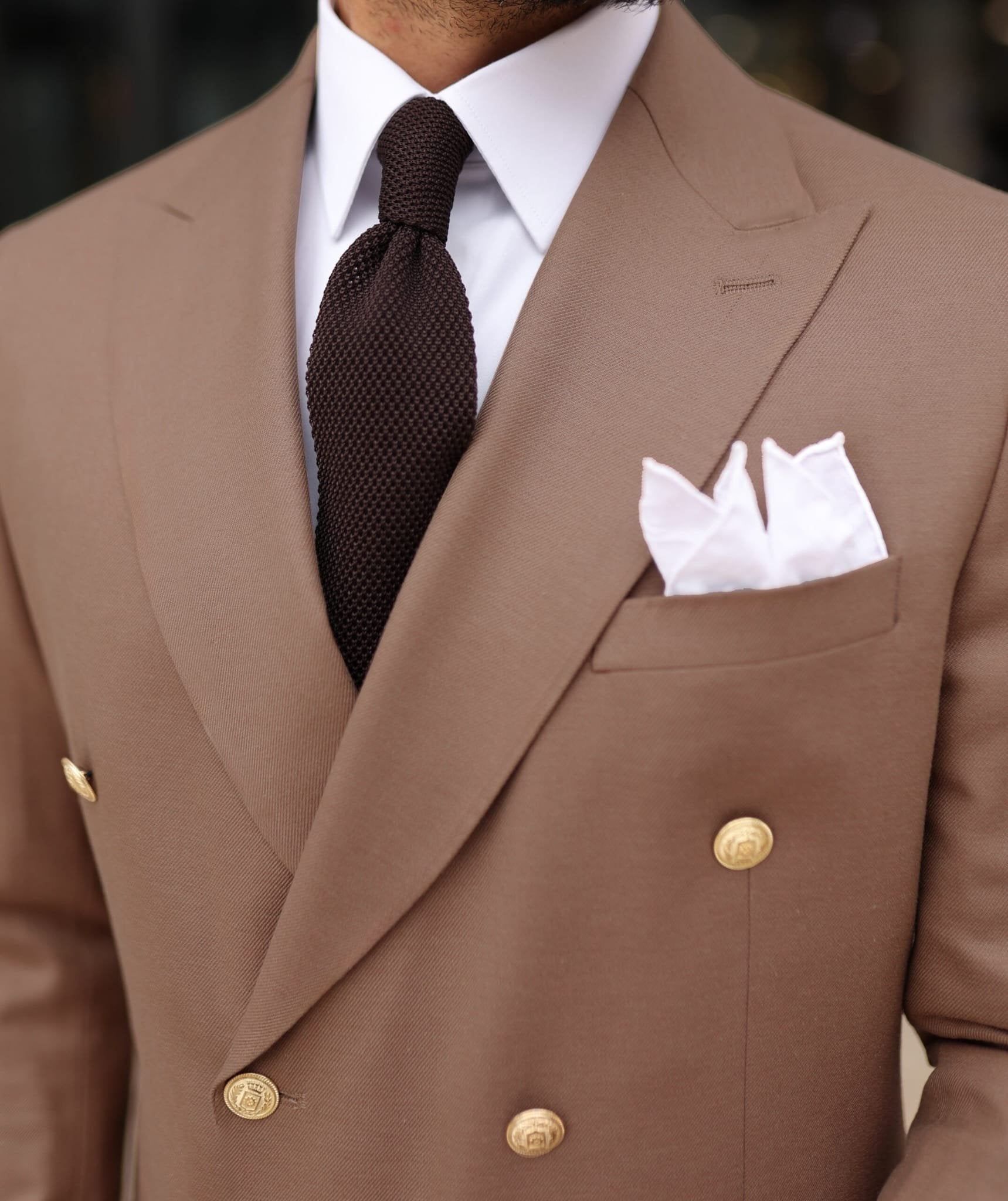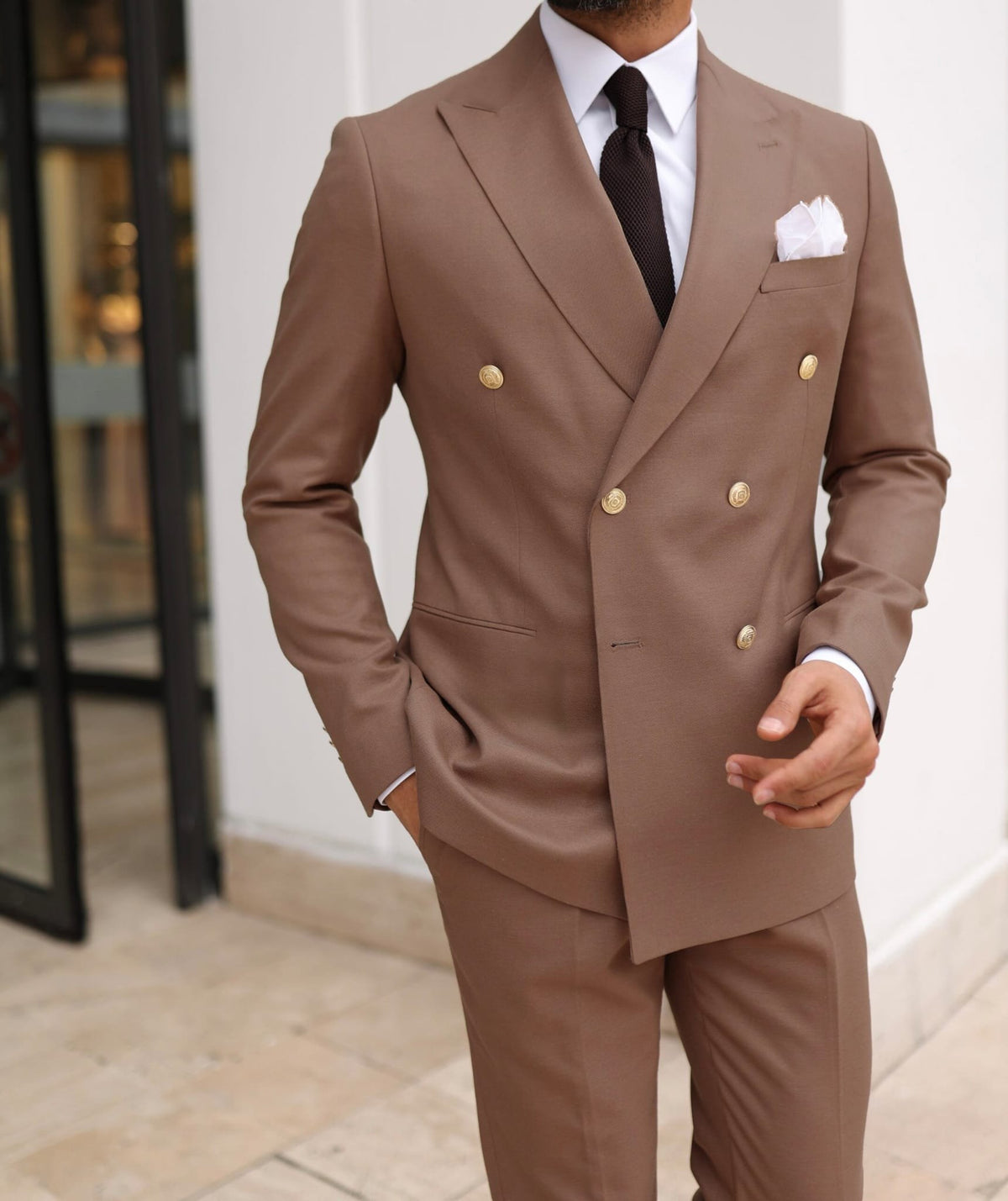 The men’s latte double-breasted suit boasts peak lapels and a tailored fit.Adorned with decorative gold buttons, the suit exudes opulence and style Crafted from luxurious fabric, it combines modern sophistication with comfort. Ideal for various occasions, it exudes individuality and style, making a lasting impression for those who appreciate both fashion and comfort.