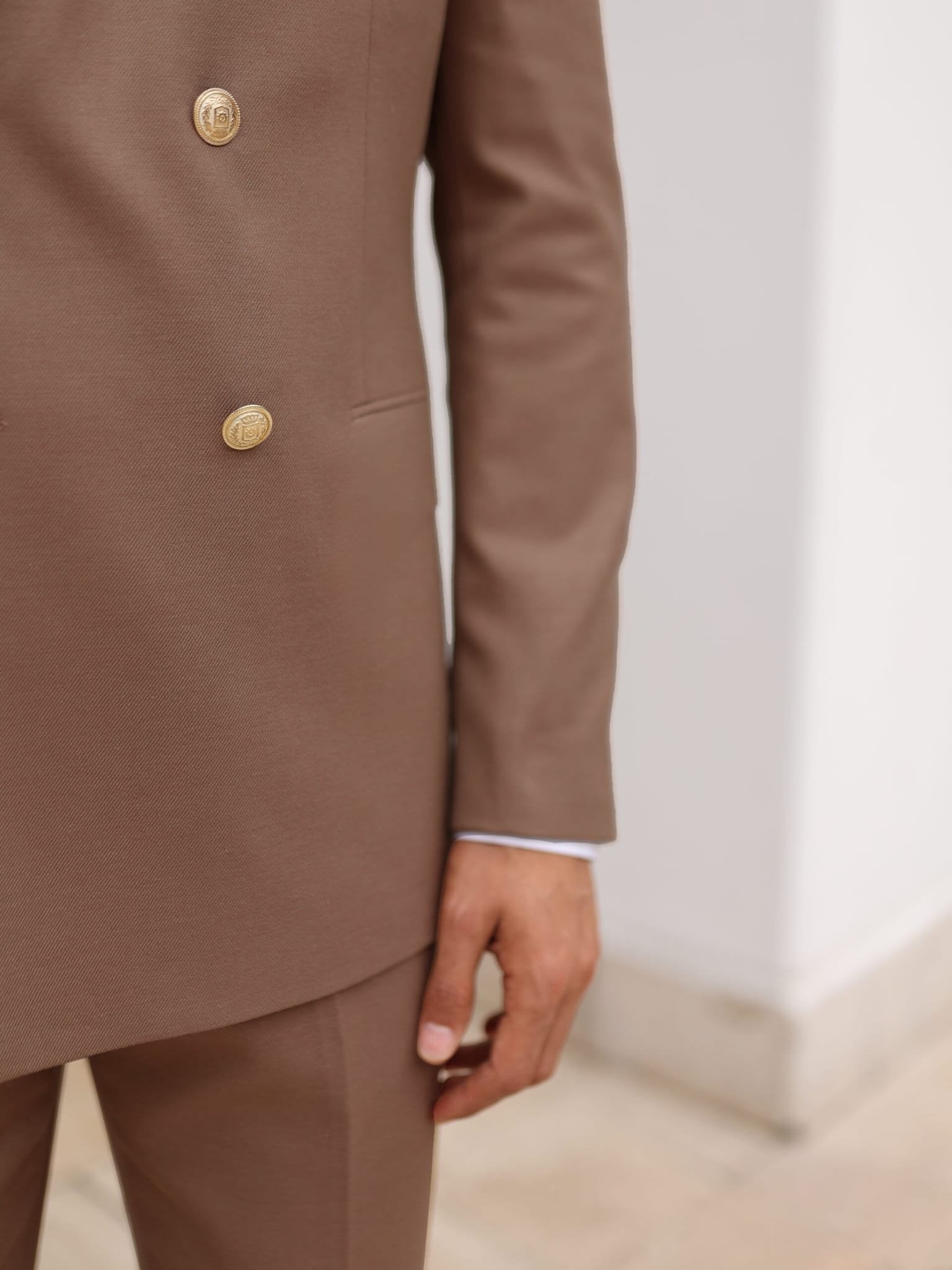 Latte slim fit double breasted men’s suit with peak lapels With decorative gold buttons