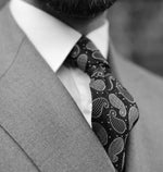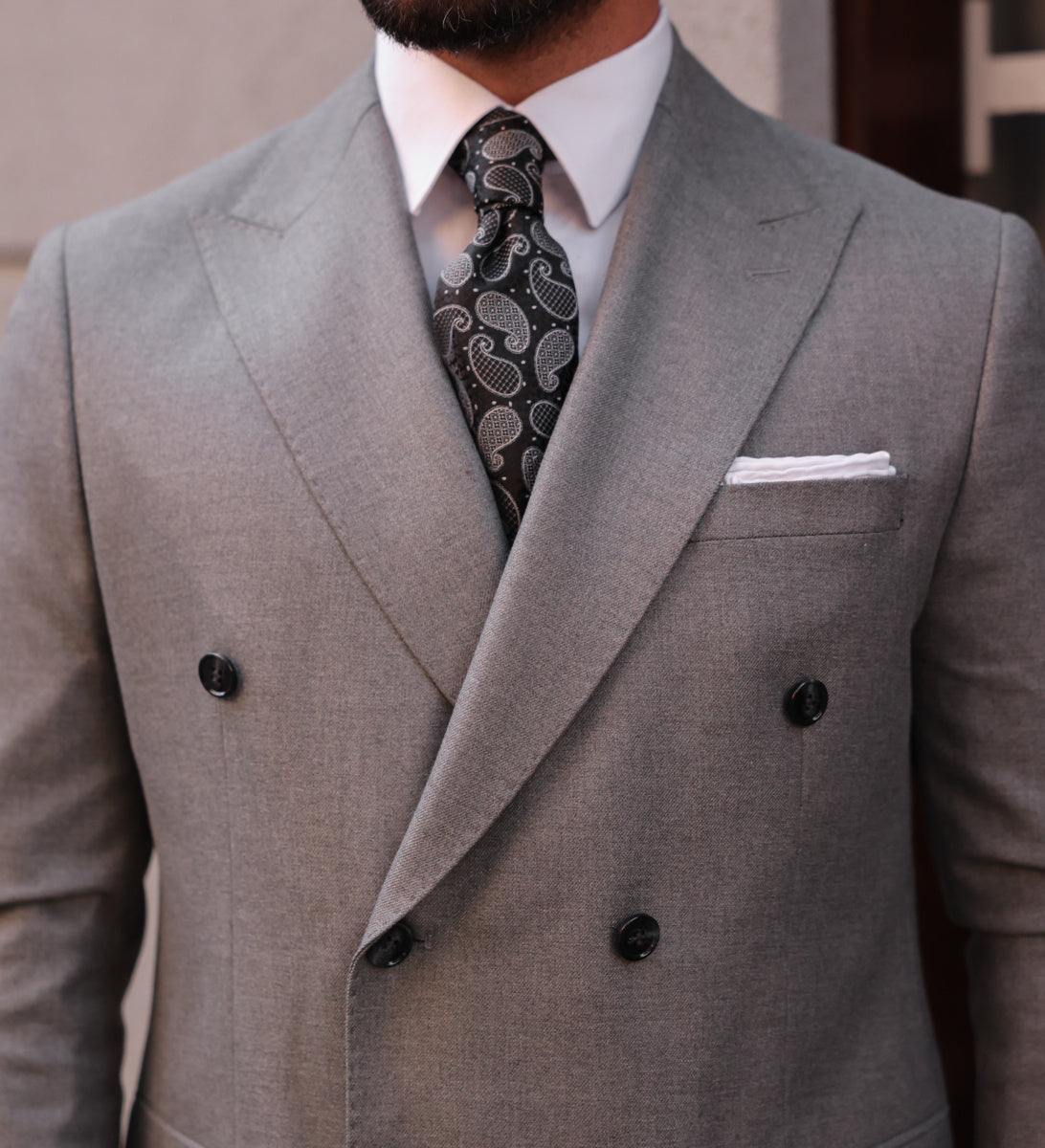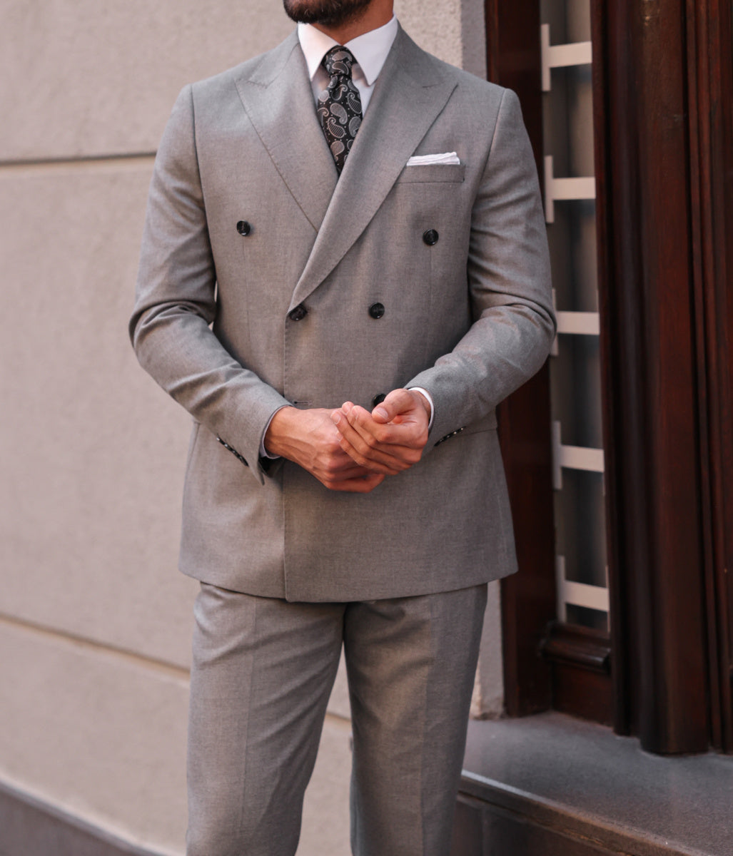 Tailored slim fit grey double breasted men’s suit with peak lapels
