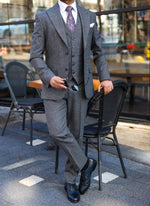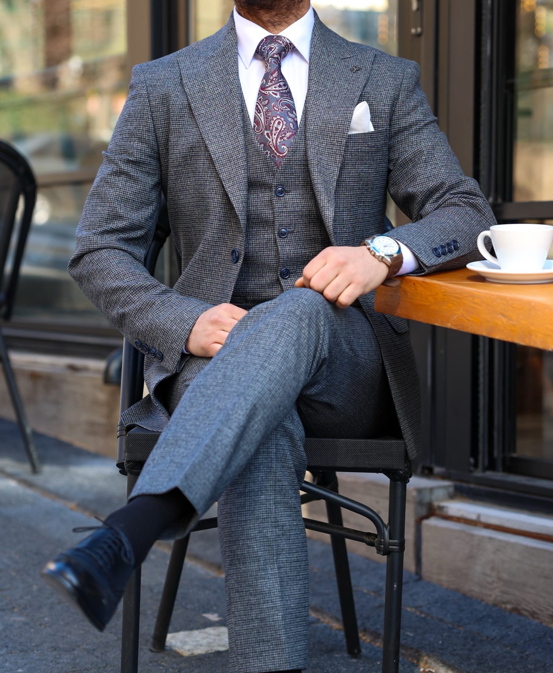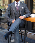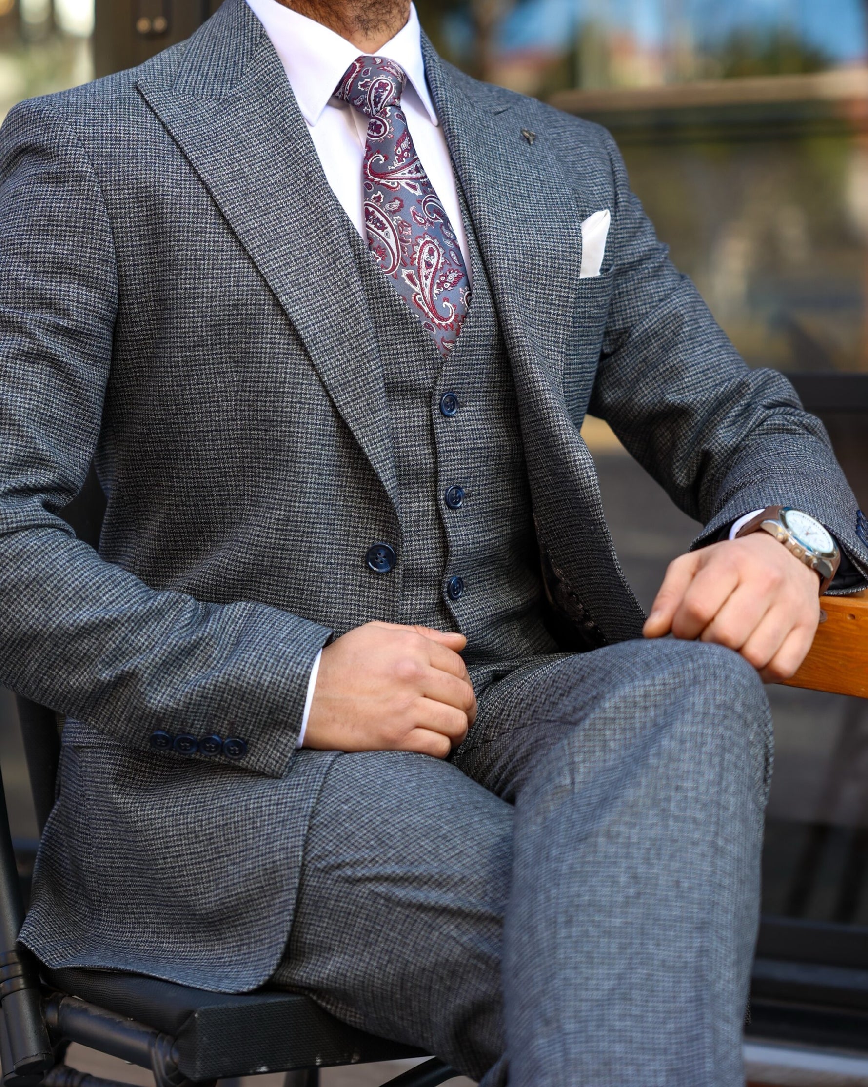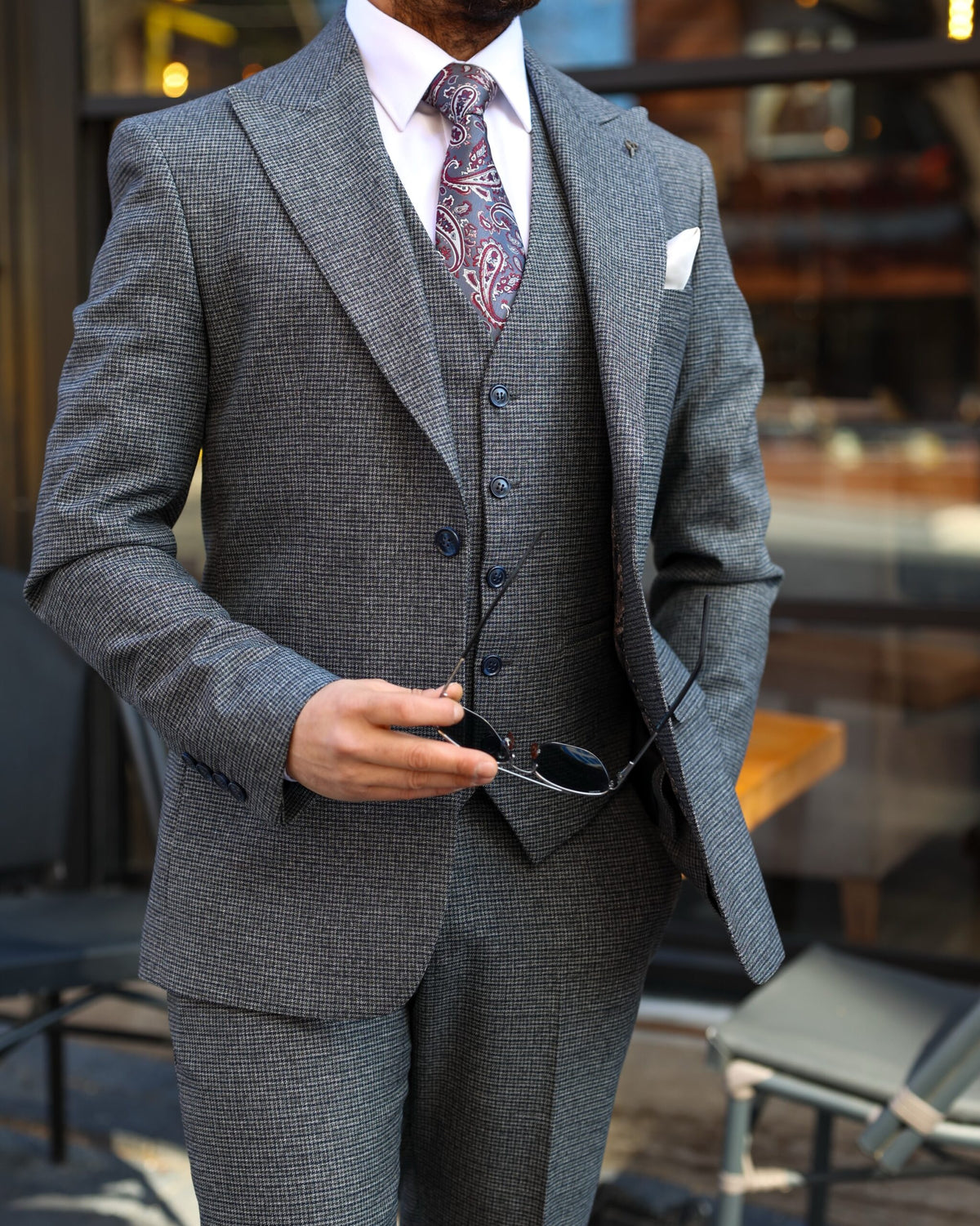 A grey with navy mix checked three piece suit is a formal attire consisting of a jacket, pants, and waistcoat (also known as a vest) in a colour scheme that combines  grey and navy  mix checked pattern. . The three pieces of the suit can be worn together for a formal occasion or dressed down with individual pieces paired with other items for a more casual look. The  grey and navy mix colour of the suit is warm and rich, while the checked pattern adds a touch of interest and personality to the outfit. dark grey is a versatile color that can be paired with a variety of shirt and tie combinations for a sophisticated and stylish appearance.
