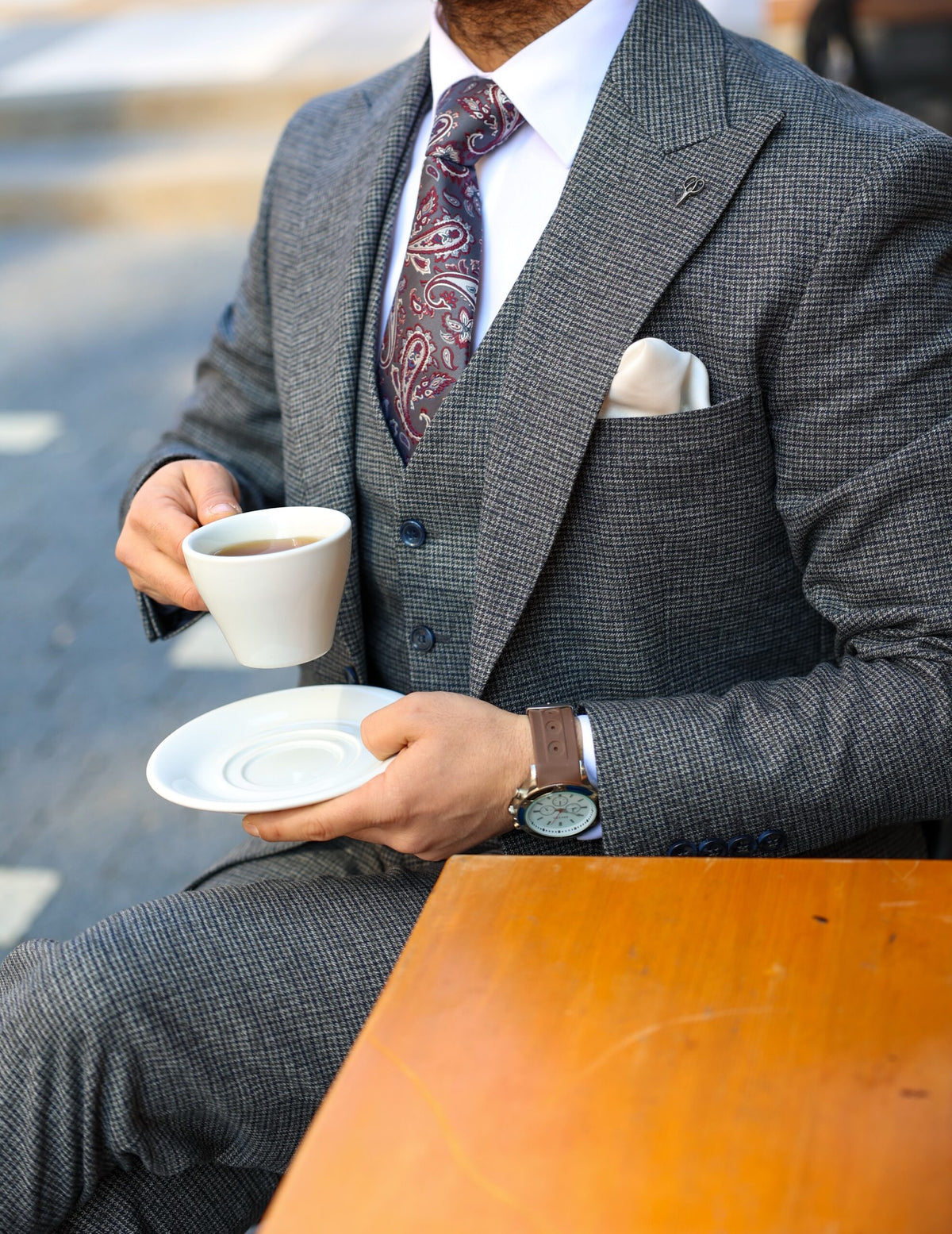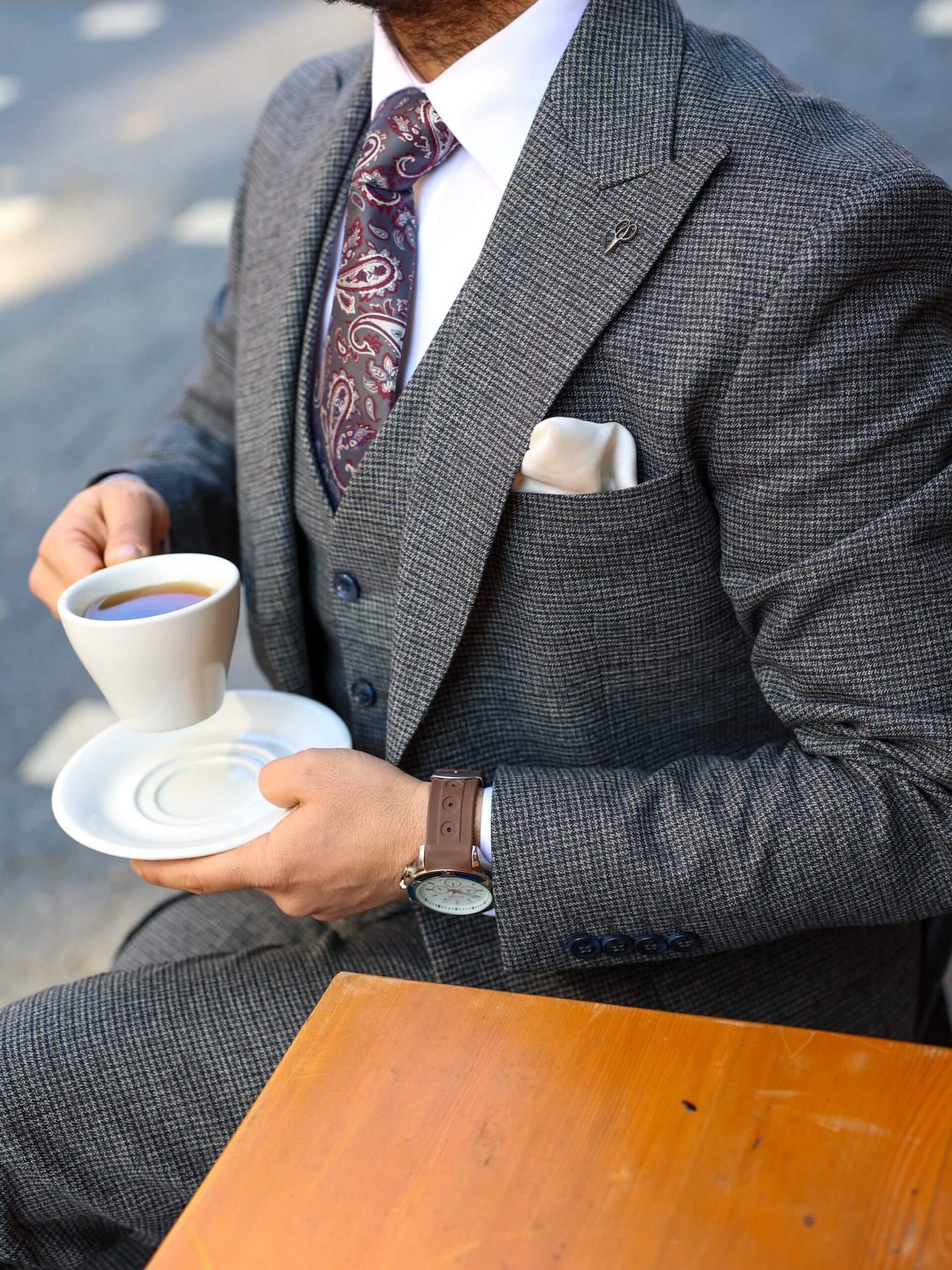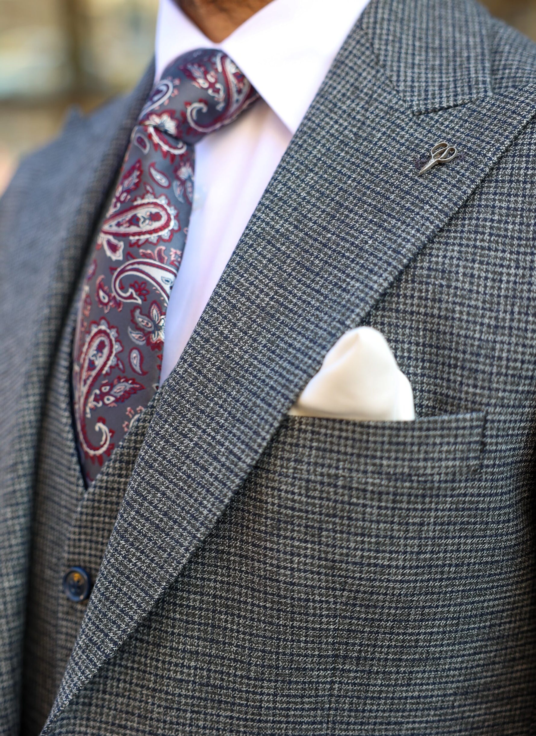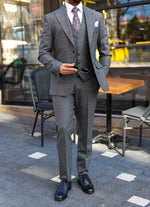 A grey with navy mix checked three piece suit is a formal attire consisting of a jacket, pants, and waistcoat (also known as a vest) in a colour scheme that combines  grey and navy  mix checked pattern. . The three pieces of the suit can be worn together for a formal occasion or dressed down with individual pieces paired with other items for a more casual look. The  grey and navy mix colour of the suit is warm and rich, while the checked pattern adds a touch of interest and personality to the outfit. dark grey is a versatile color that can be paired with a variety of shirt and tie combinations for a sophisticated and stylish appearance.