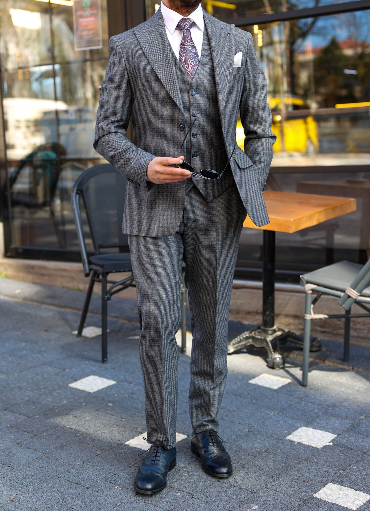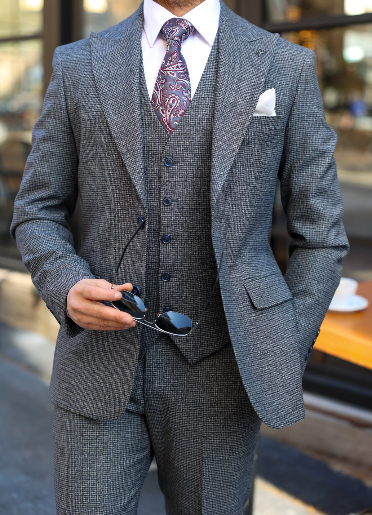 Slim fit grey and navy mix checked men’s three piece suit with peak lapels
