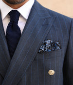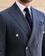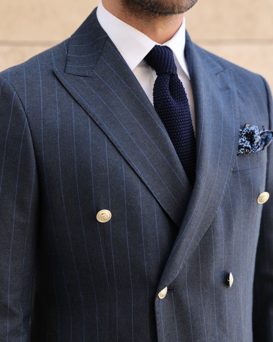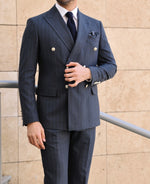 TAILORED SLIM fit DARK NAVY BLUE BASE  WITH BLUE pinstripe double BREASTED with peak lapels gold buttons men's SUIT