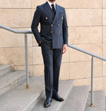 Our dark navy blue base with blur pinstriped double-breasted men’s suit exudes an air of timeless elegance and sophistication. Crafted from high-quality fabric, it combines classic tailoring with modern refinement. The deep navy hue adds depth and richness, while the subtle pinstripes provide a touch of understated charm. The double-breasted silhouette enhances the suit’s formality, accentuating the wearer’s masculine silhouette and projecting confidence. Whether worn for a formal event, a business meeting, or a special occasion, this suit commands attention and admiration.Adorned with decorative gold buttons, the suit exudes opulence and style. Its impeccable craftsmanship, attention to detail, and impeccable fit make it a wardrobe staple for the discerning gentleman who appreciates both style and substance.