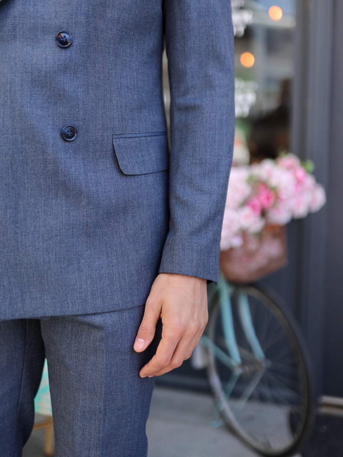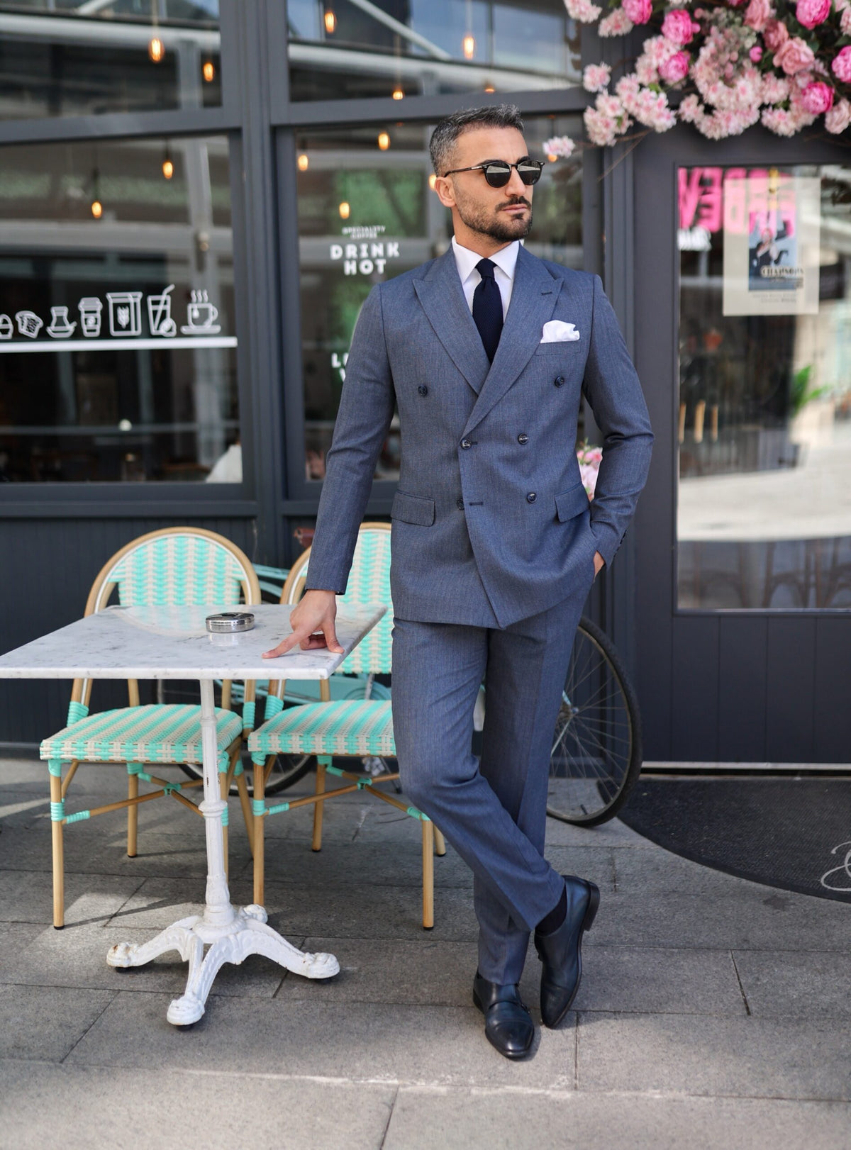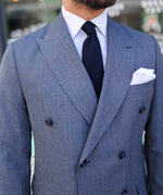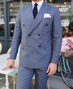 Tailored slim fit slight iridescent effect blue double breasted men's suit with peak lapels