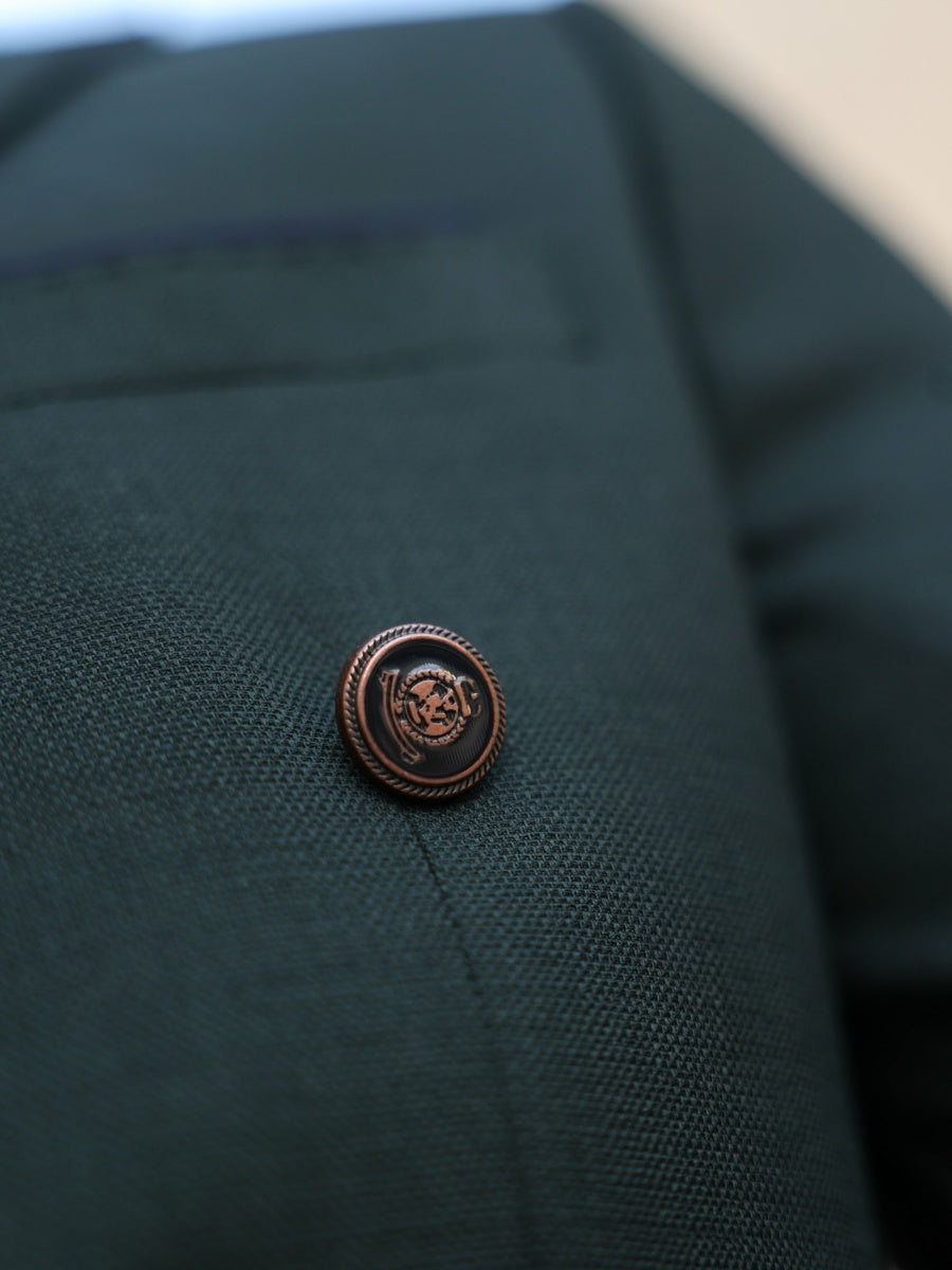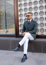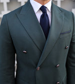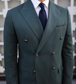 This tailored slim fit dark green double breasted blazer paired with white tailor fit trousers is a classic combination for a sophisticated and refined look. The blazer features peak lapels, double-breasted buttons, and flap pockets. The trousers are tailored to fit perfectly with a straight leg design and a flat front. Together, this suit is perfect for formal occasions, weddings, or any event that requires a touch of elegance.