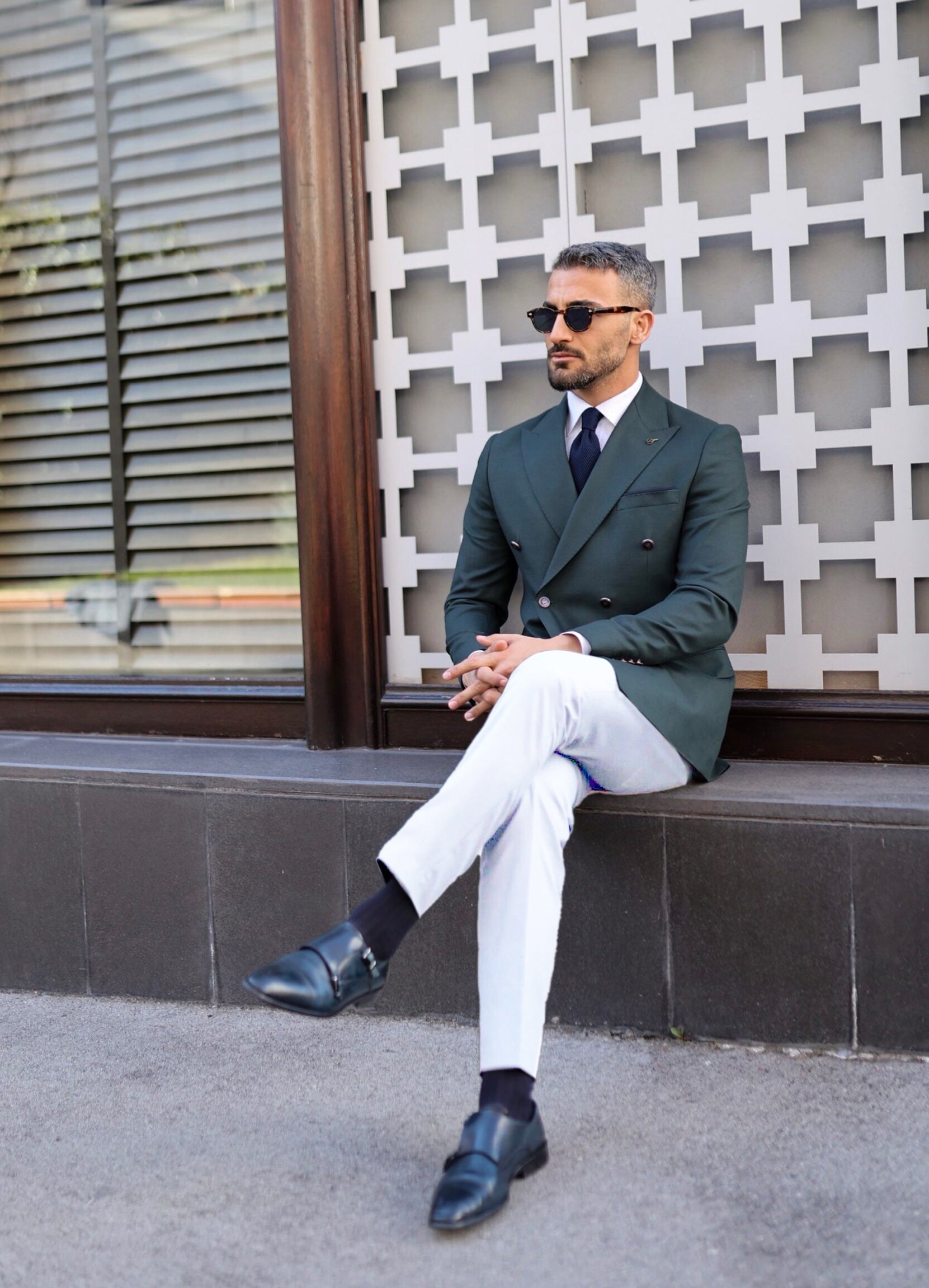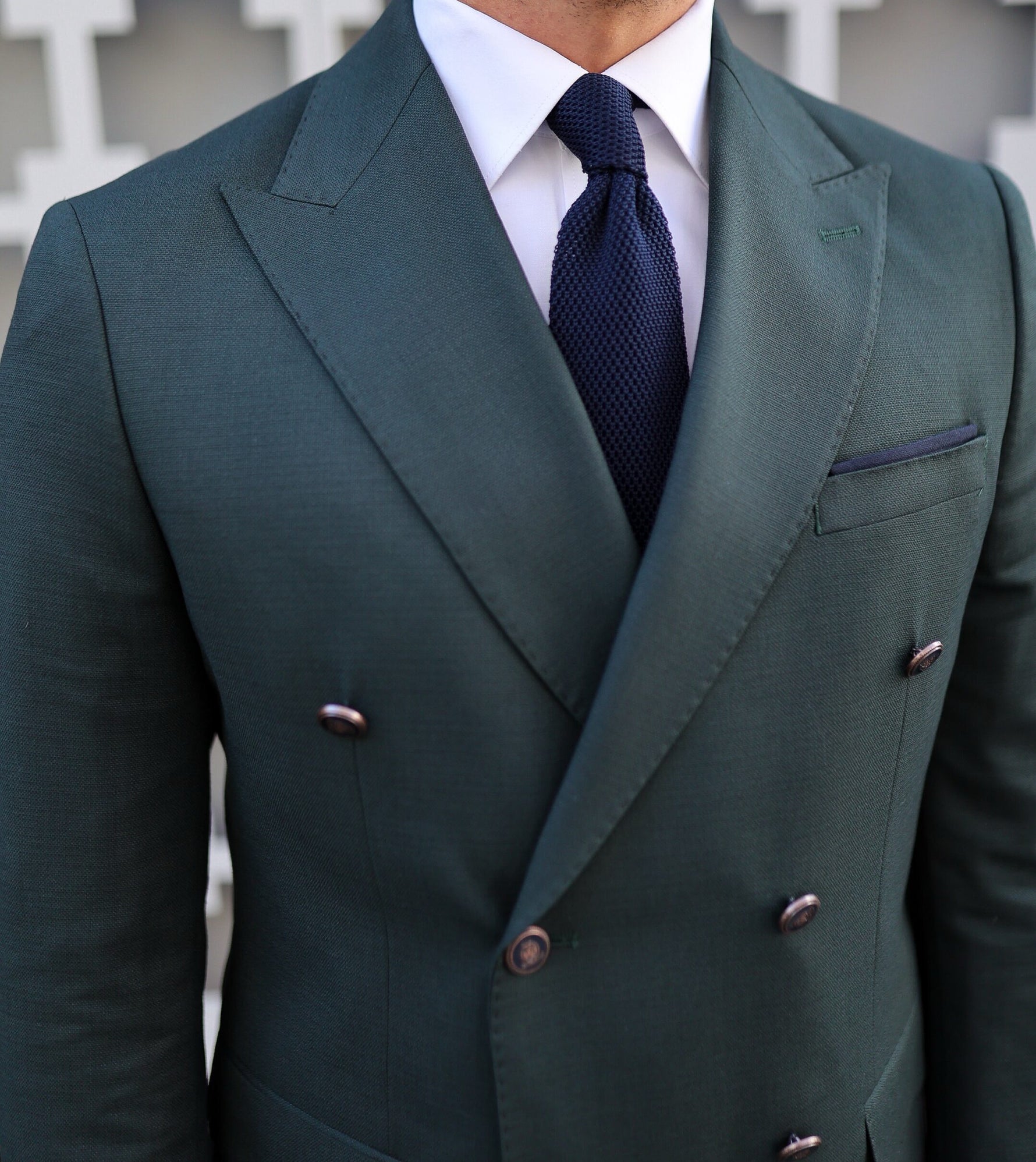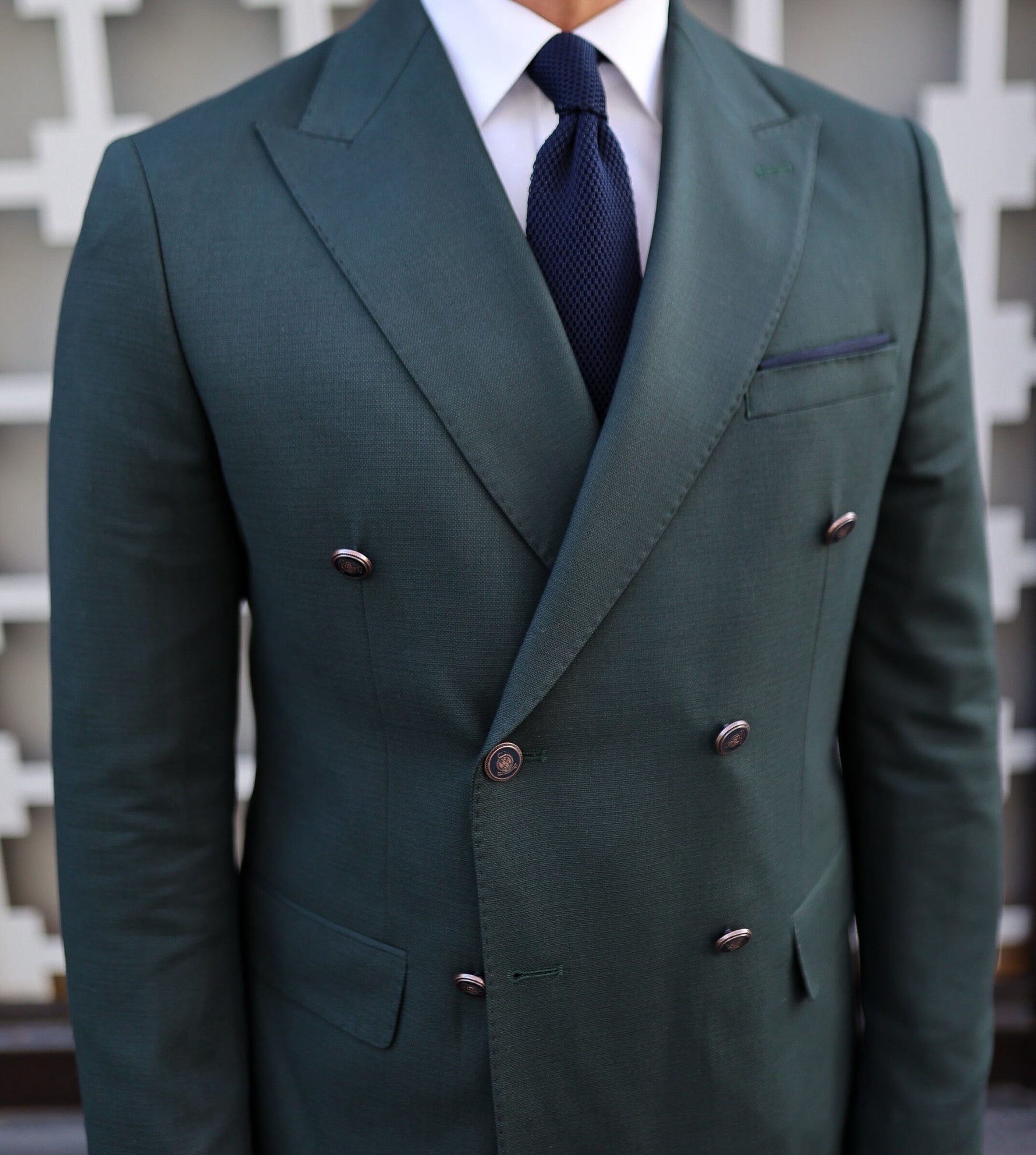 Tailored slim fit dark green and white trousers double breasted mixed combine men’s suit with peak lapels