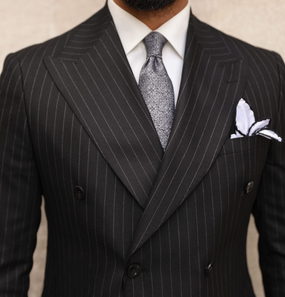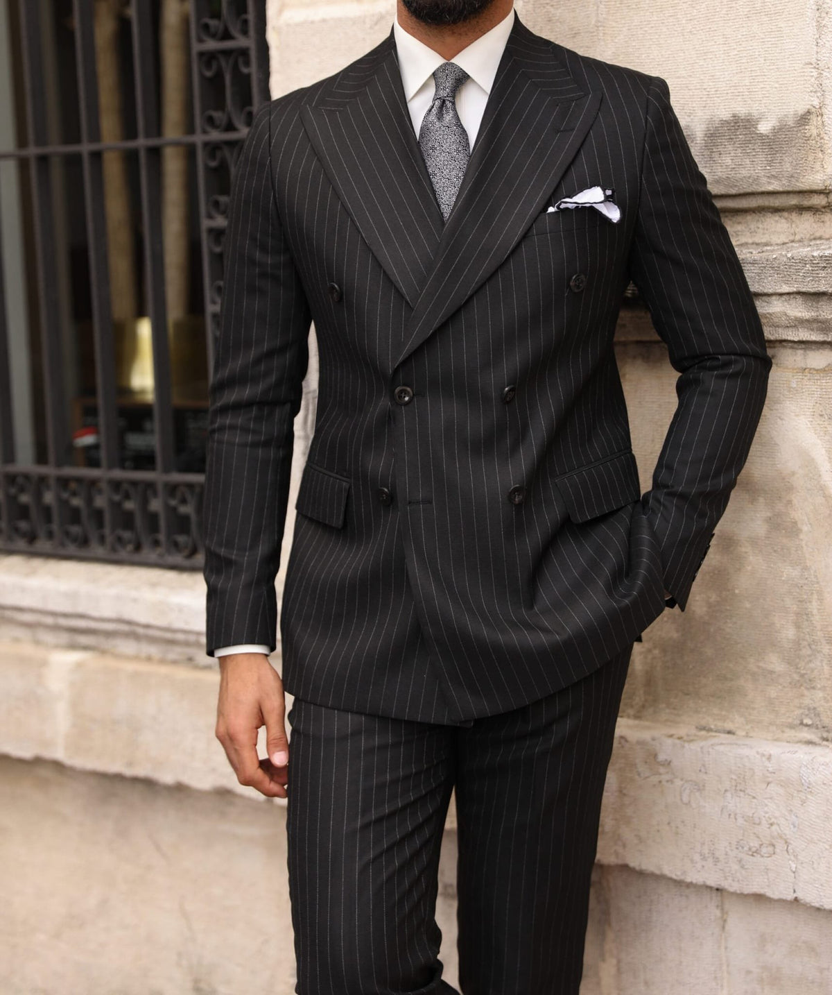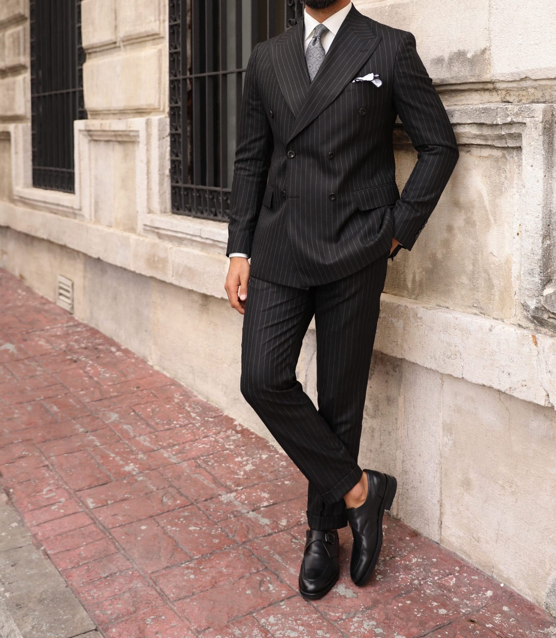 A tailored slim fit pinstripe all black men’s double breasted suit with peak lapels is a timeless and classic choice for any formal event. The pinstripe pattern adds a touch of sophistication and formality to the sleek all-black colour scheme, while the double-breasted jacket and peak lapels create a sense of elegance and style. The slim fit tailoring creates a modern and sharp silhouette, perfect for showing off your sense of style and sophistication. This suit can be paired with a crisp white dress shirt, black dress shoes, and a sleek tie to complete a polished and refined look. Whether attending a black-tie event or a formal business meeting, this suit is a smart and stylish choice for any fashion-conscious man who wants to make a lasting impression.