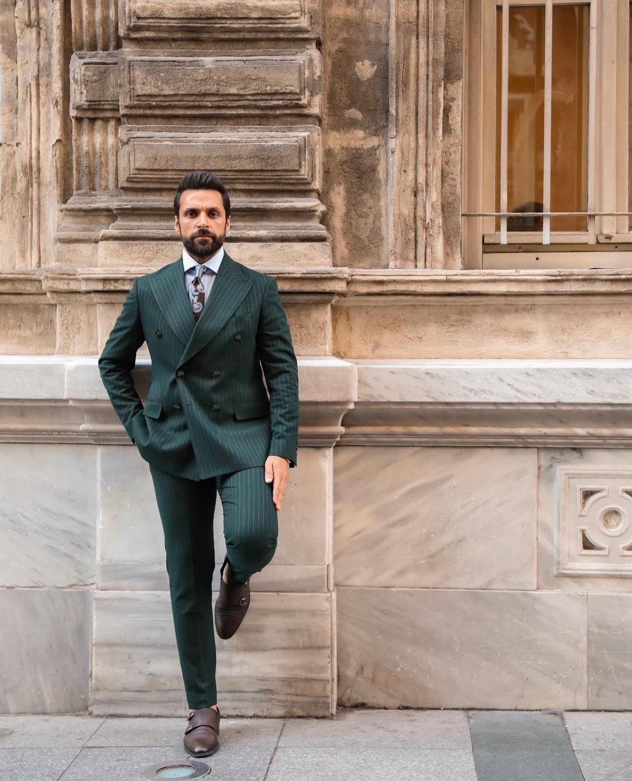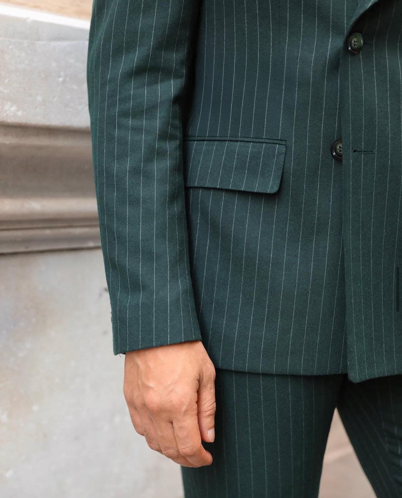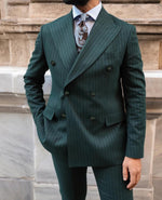 Tailored slim fit forest green double breasted pinstripe men’s suit with peak lapels