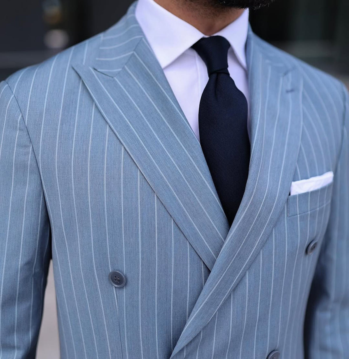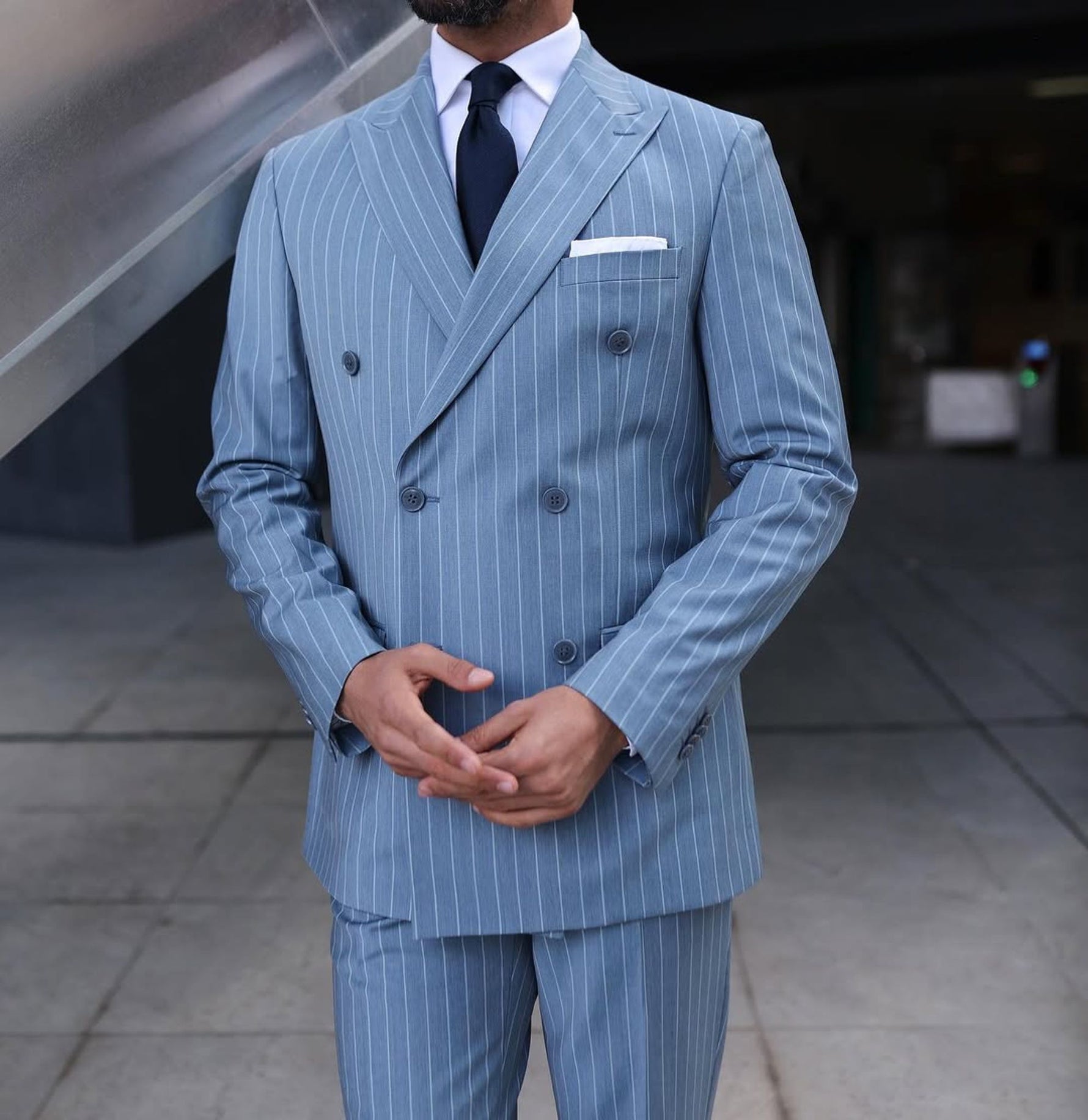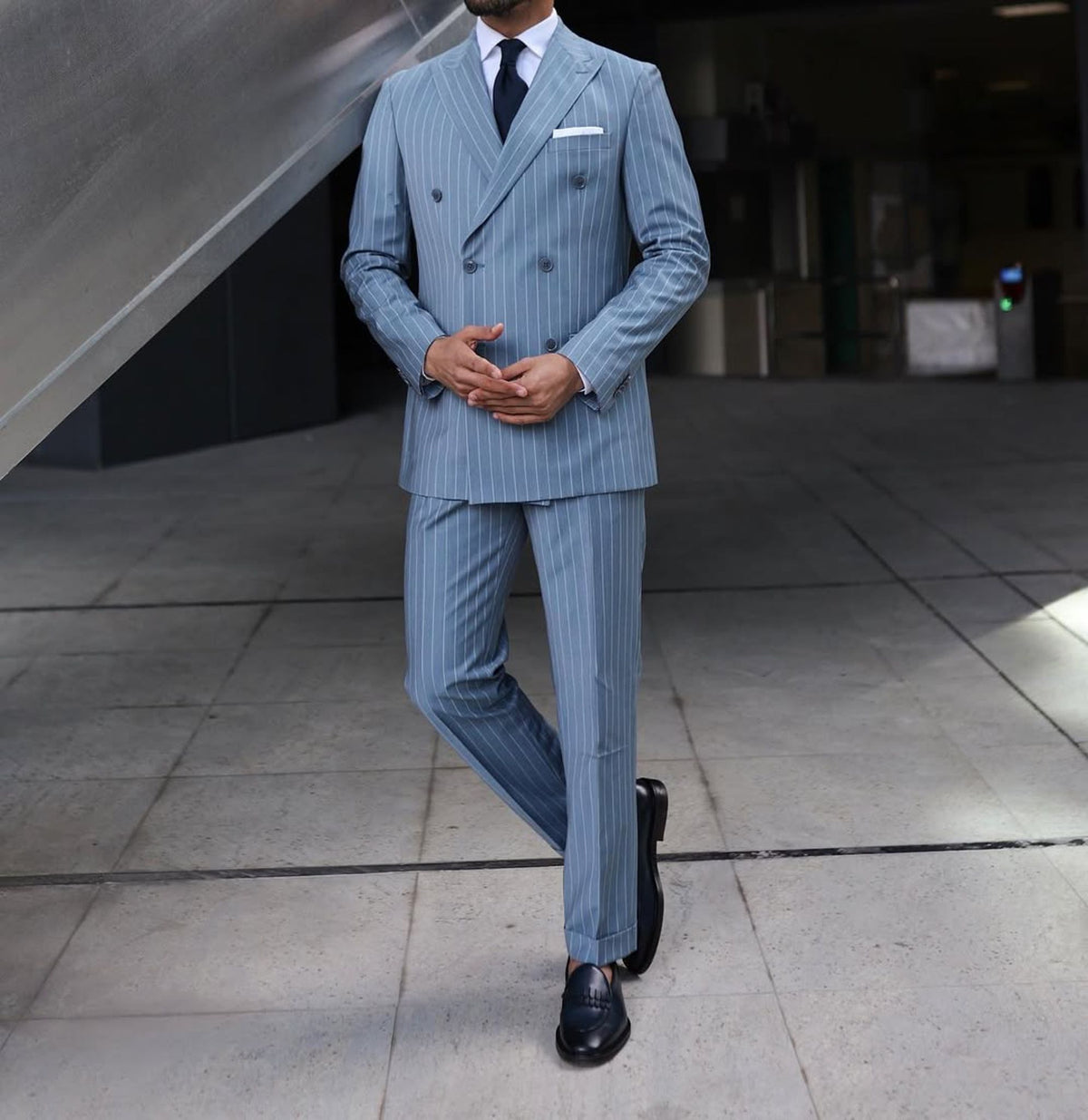This suit can be paired with a crisp white shirt and a dark tie to create a polished, professional look. It can also be dressed down with a light-coloured shirt and no tie for a more relaxed yet still stylish appearance. Overall, the turquoise pinstripe double-breasted suit with peak lapels is a versatile and stylish addition to any modern man’s wardrobe.