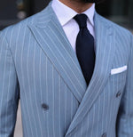 Tailored slim fit pinstripe turquoise double breasted men’s suit with peak lapels