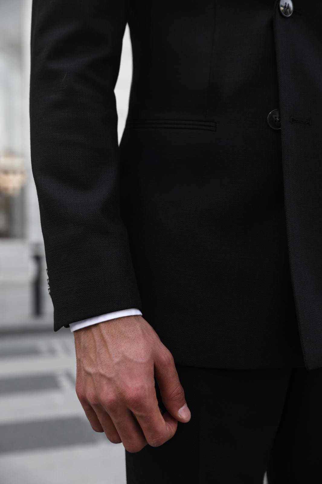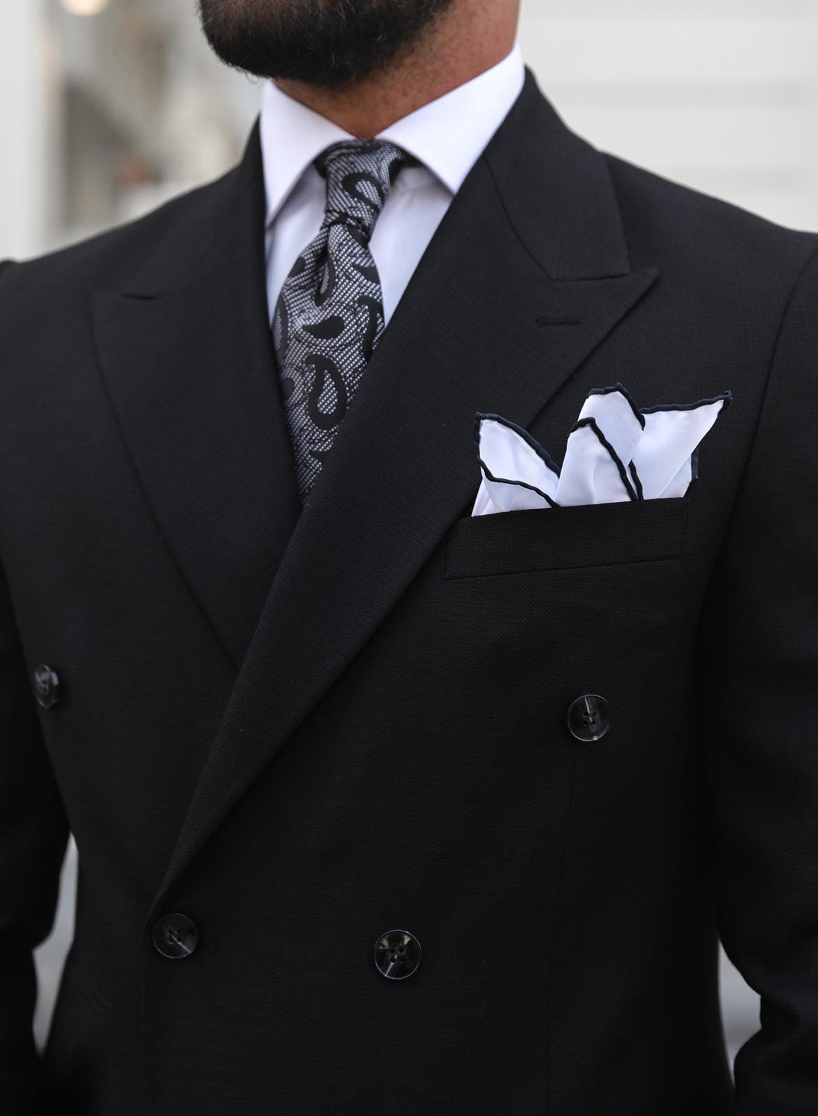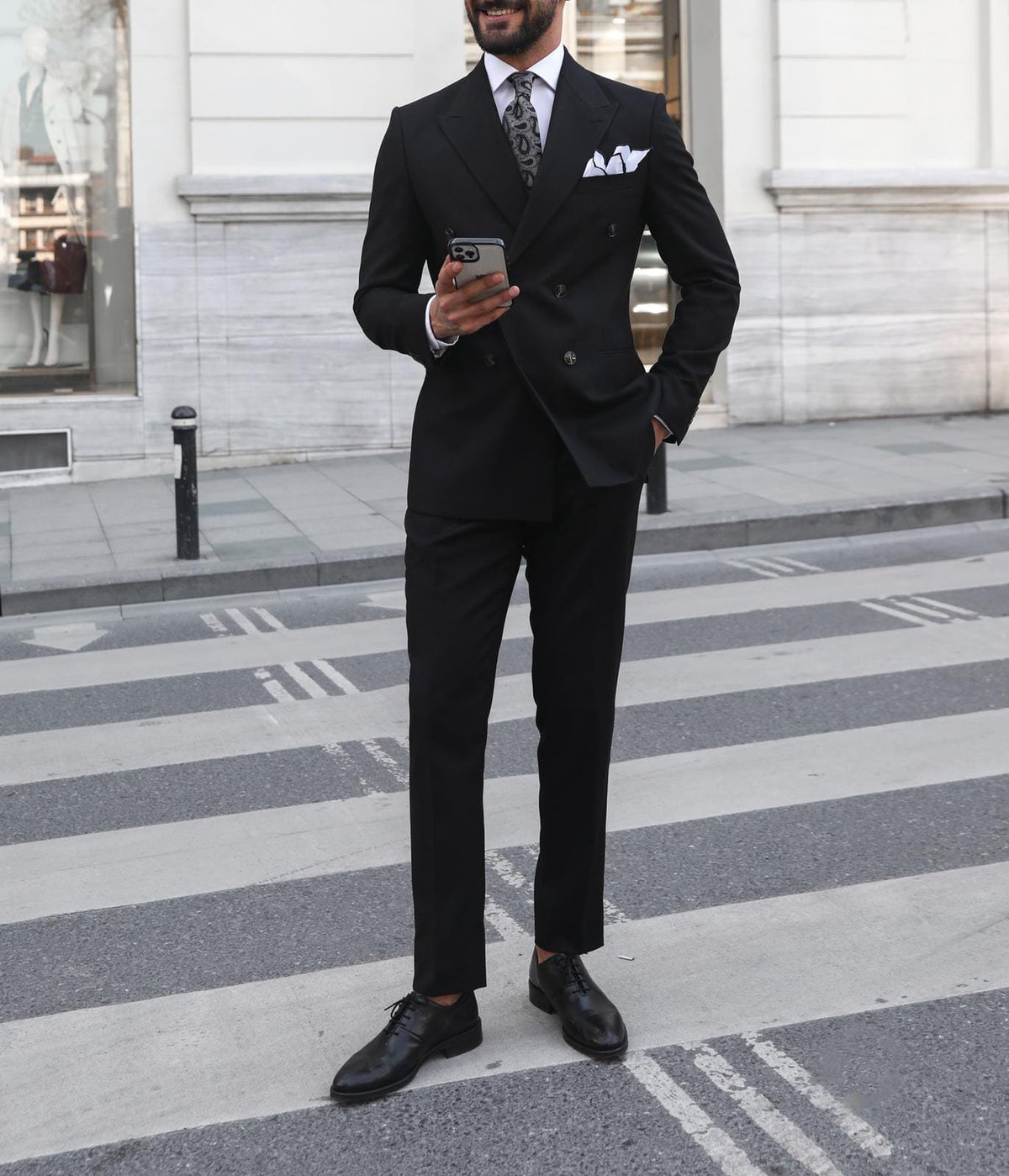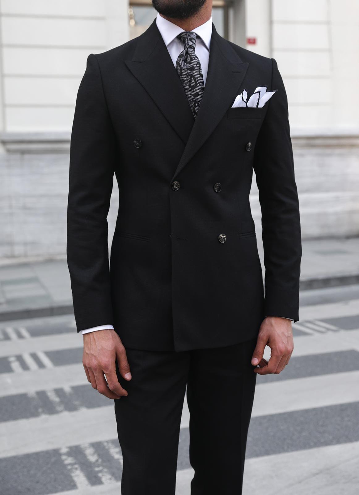 Tailored slim fit black double breasted men’s suit with peak lapels