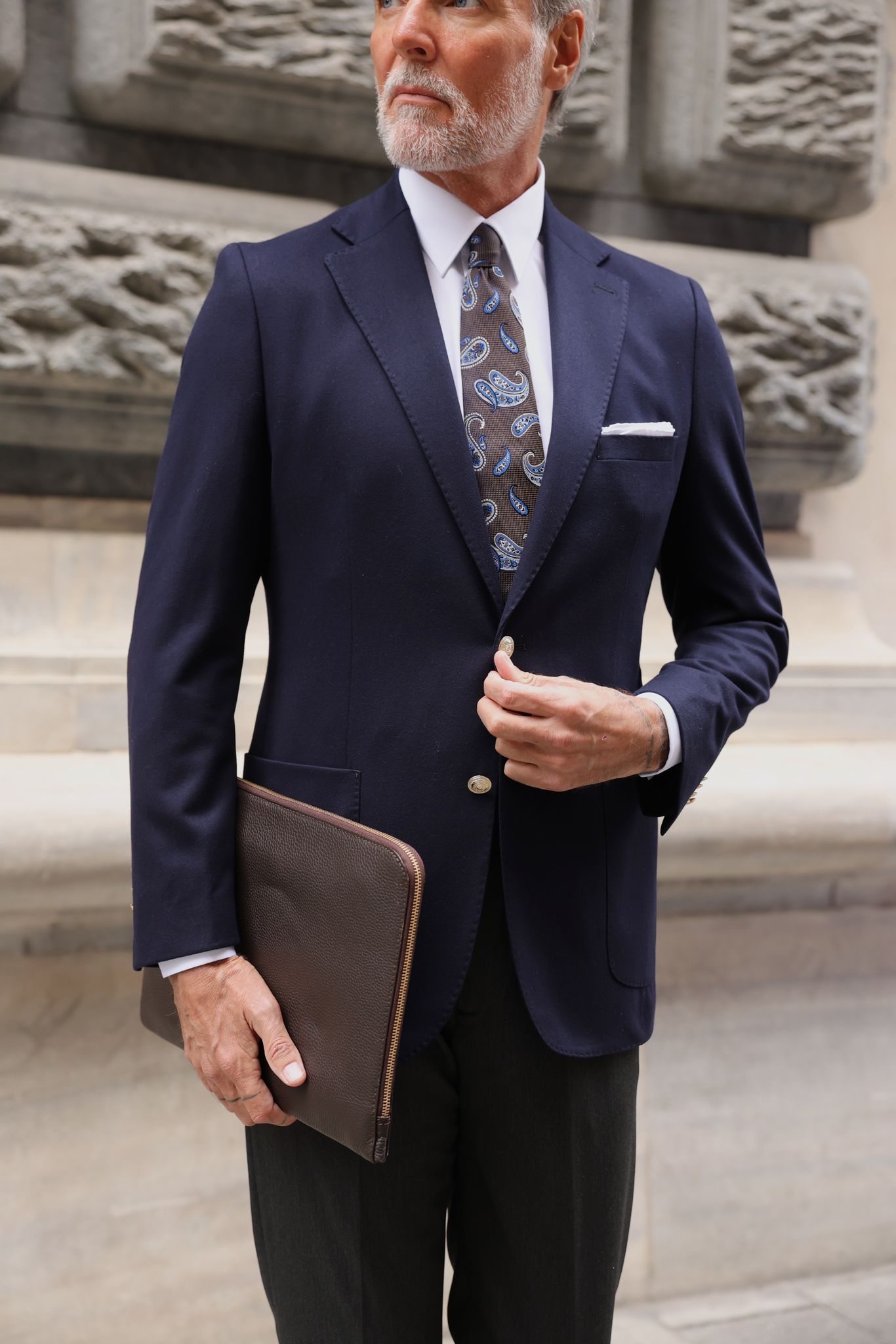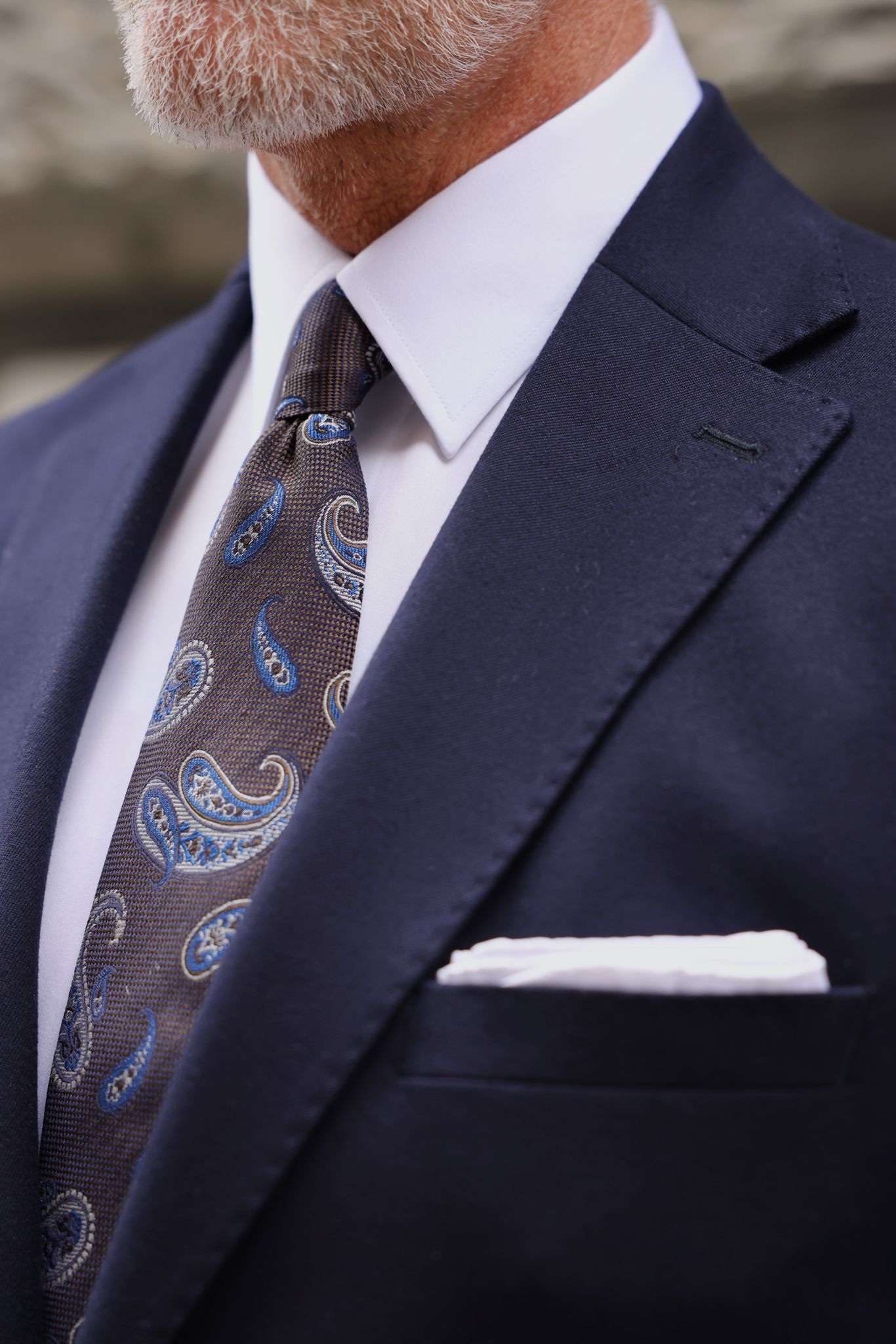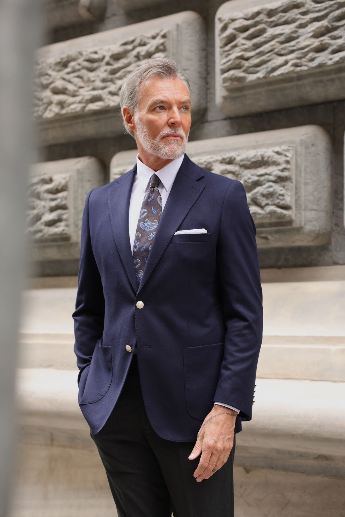 A dark blue plain blazer paired with charcoal grey trousers is a classic and stylish combination for any occasion. The dark blue plain blazer adds a touch of texture and pattern to the outfit, while the charcoal grey trousers provide a sleek and sophisticated base. Adorned with decorative gold buttons, the suit exudes opulence and style.  This combination is perfect for both casual and formal occasions, and can be dressed up or down with the right accessories and shoes.