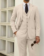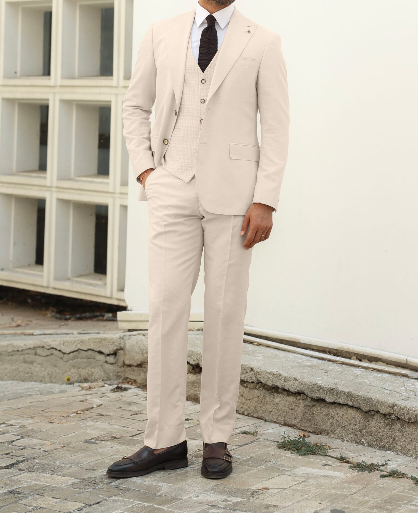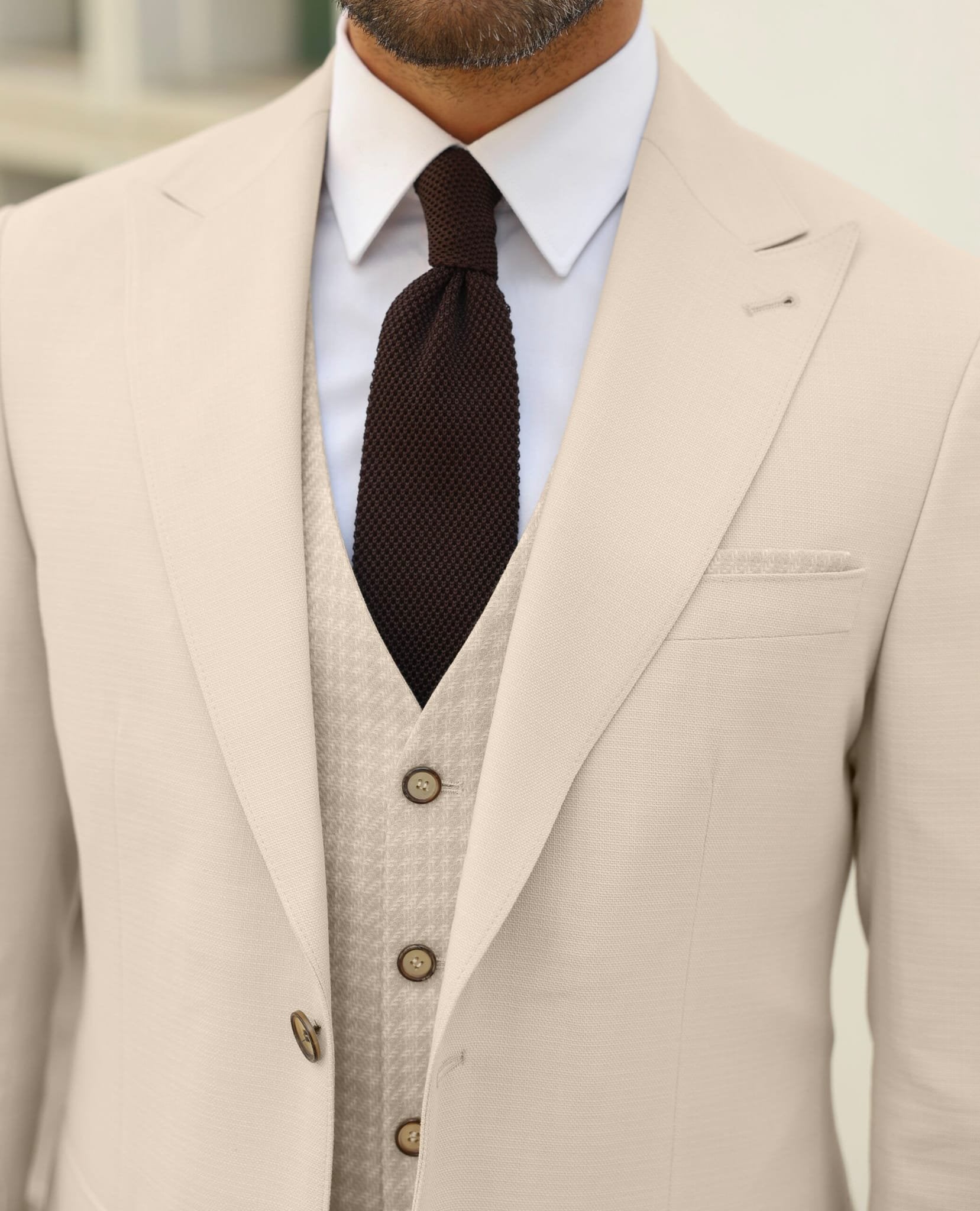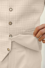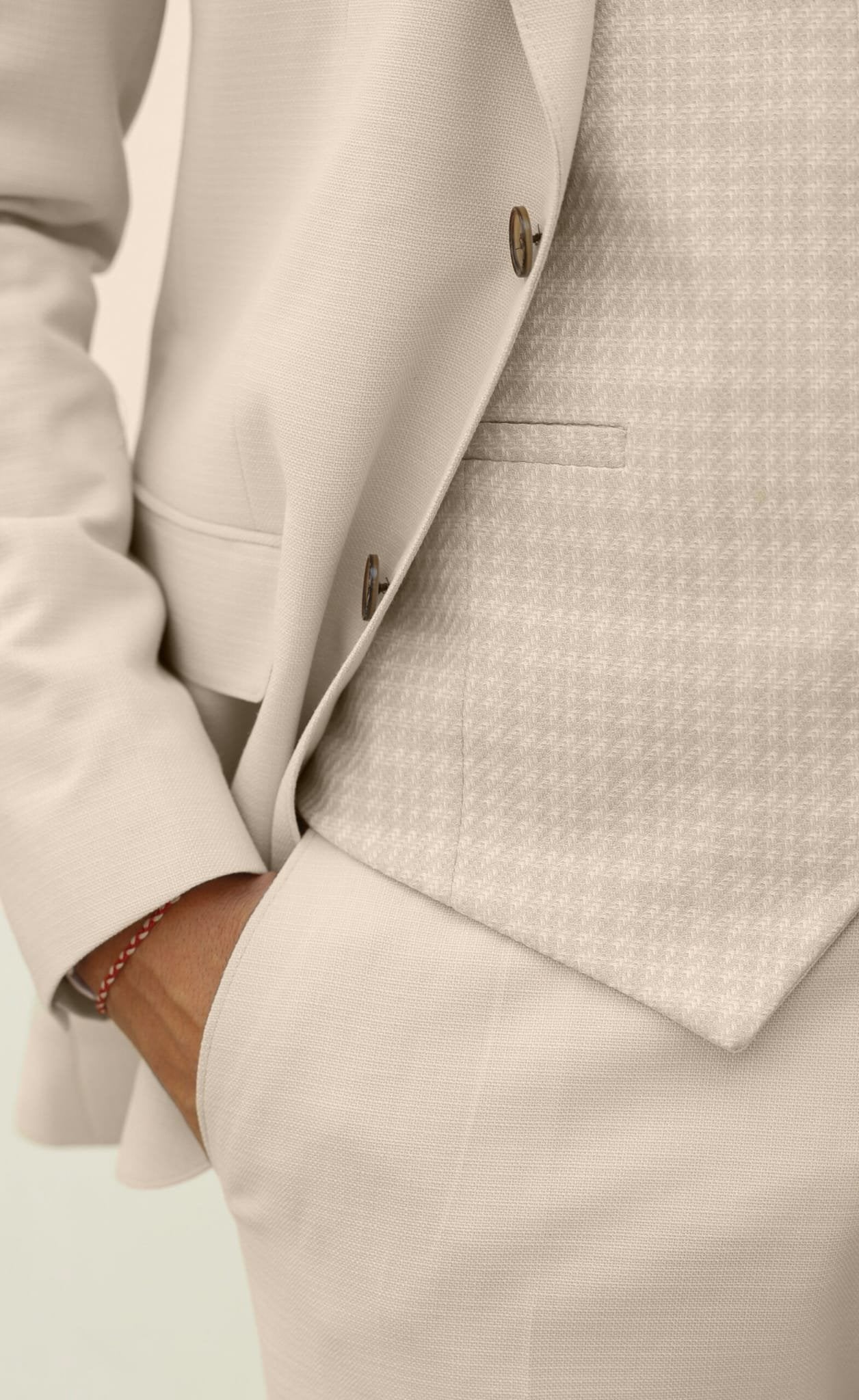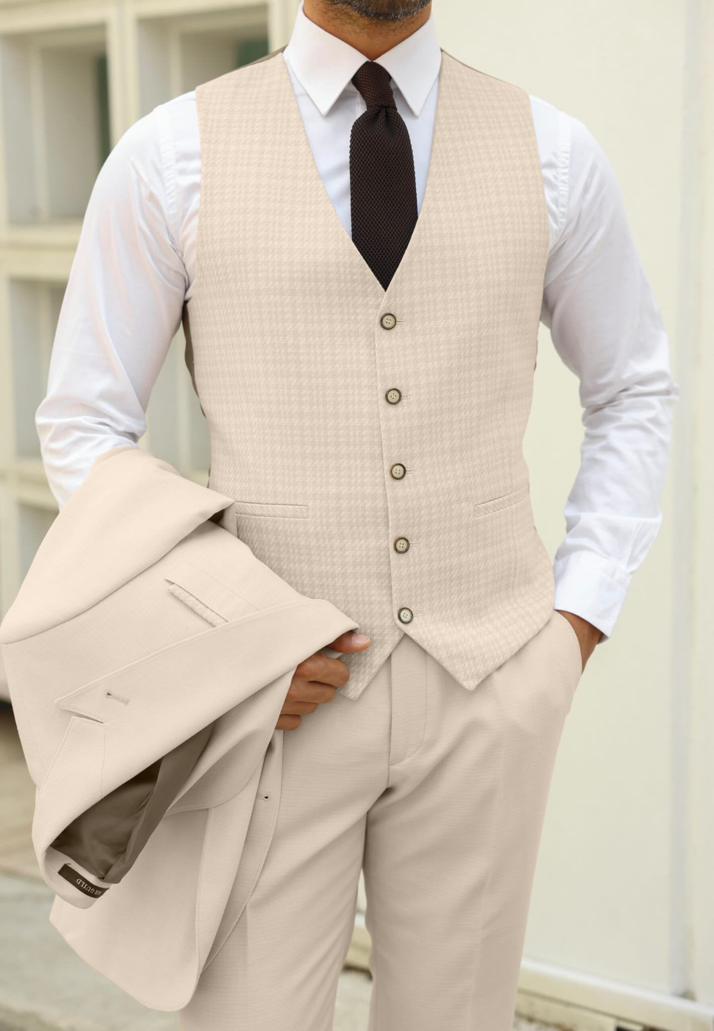 This men’s cream three-piece suit offers exceptional versatility with a reversible waistcoat, allowing for two distinct looks in one elegant ensemble. Crafted from a high-quality wool blend, the suit features a tailored fit that enhances the wearer’s silhouette. The single-breasted jacket and matching trousers complement the innovative waistcoat, which can be worn on either side to effortlessly switch between a classic and a contemporary style. Ideal for weddings, business events, or sophisticated gatherings, this suit combines timeless design with modern functionality, ensuring you always make a refined statement, no matter the occasion.
