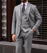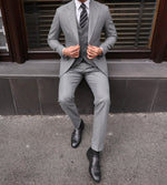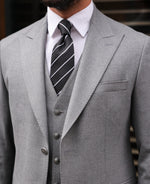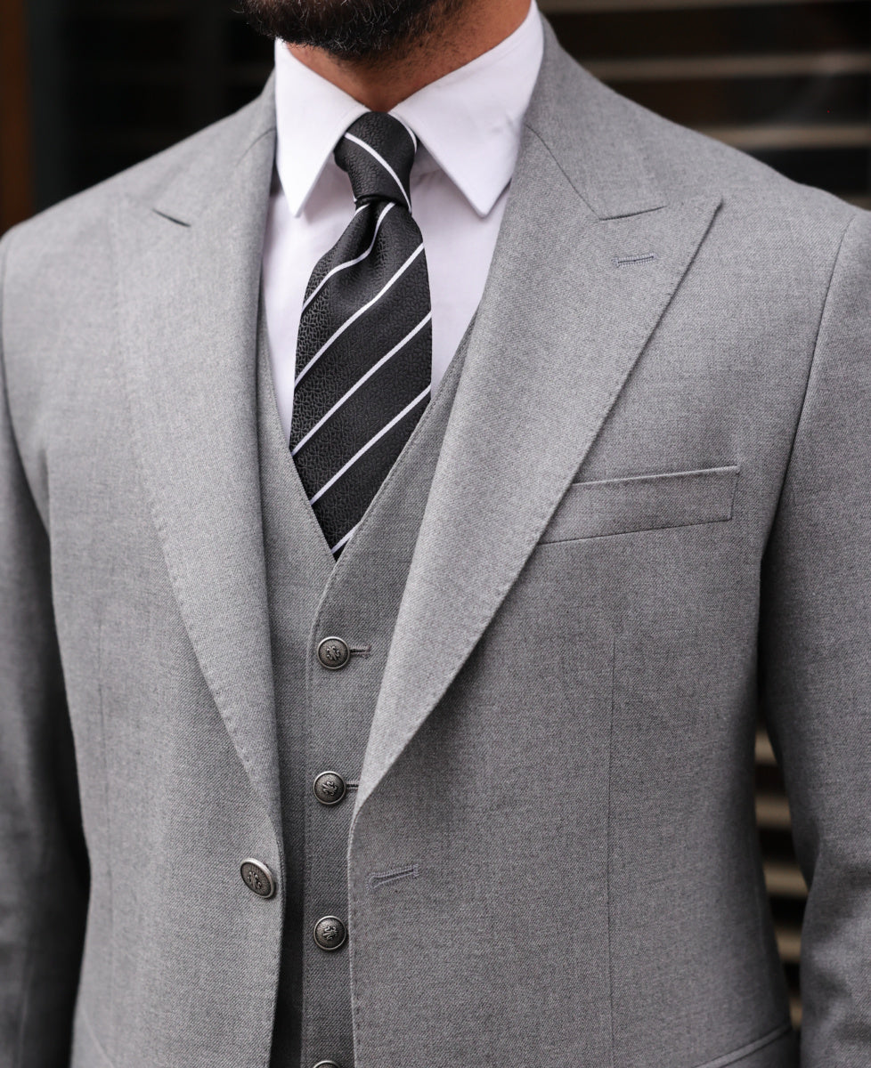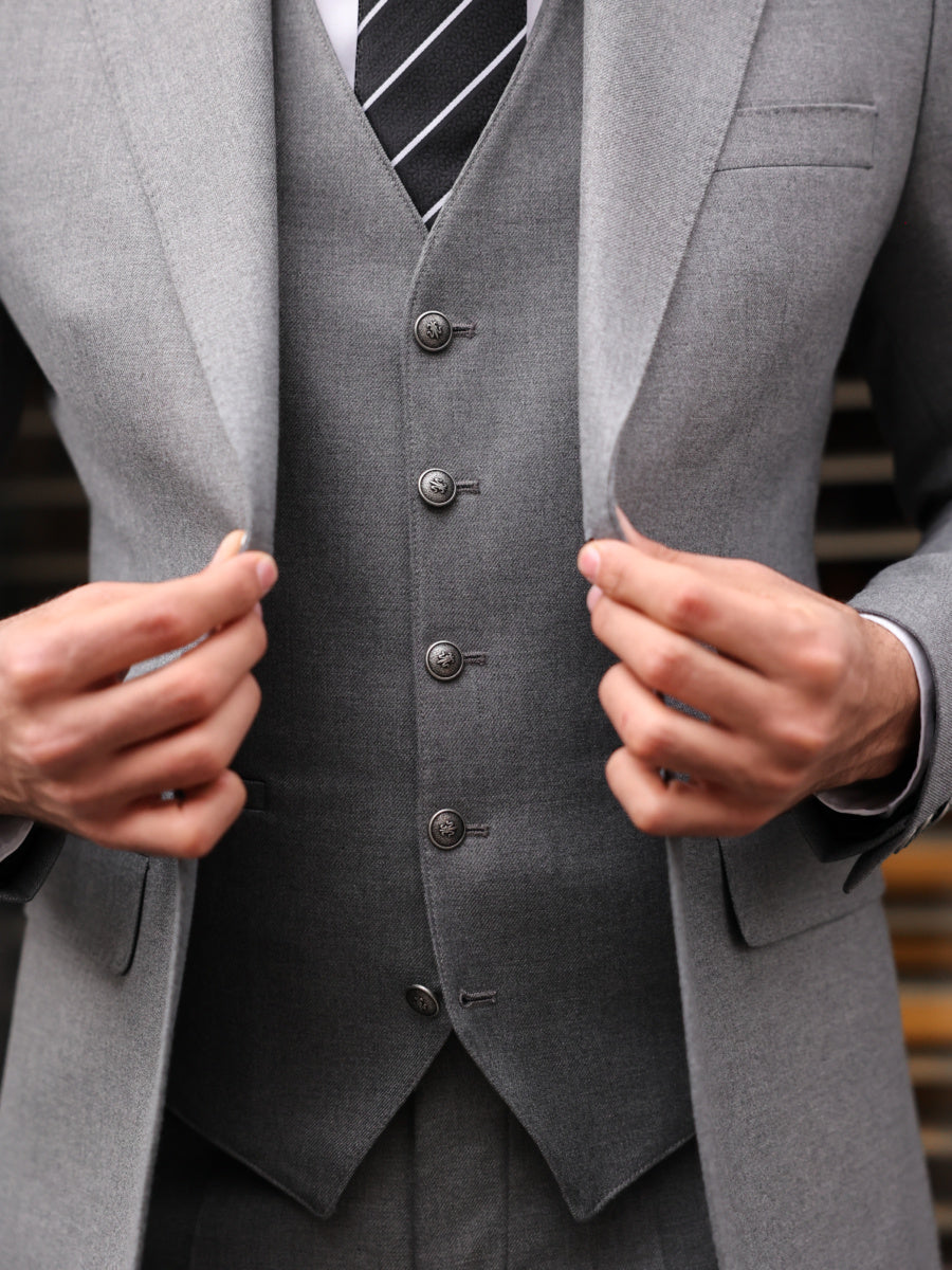 Slim fit mid grey men’s three piece suit with peak lapels and with decorative silver buttons