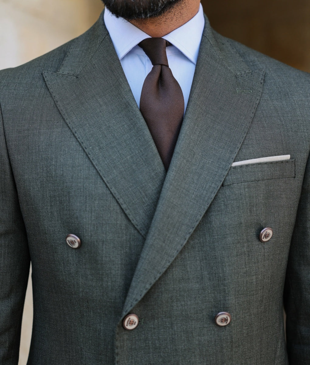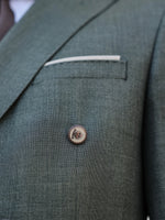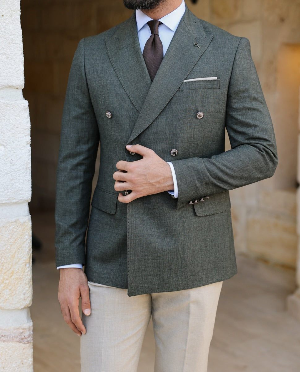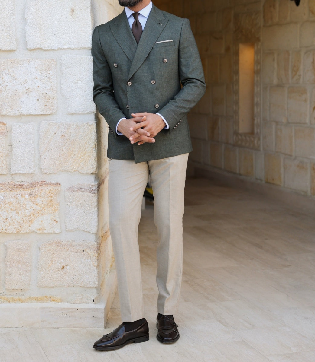 This tailored slim fit green double breasted blazer paired with cream tailor fit trousers is a classic combination for a sophisticated and refined look. The blazer features peak lapels, double-breasted buttons, and flap pockets. The trousers are tailored to fit perfectly with a straight leg design and a flat front. Together, this suit is perfect for formal occasions, weddings, or any event that requires a touch of elegance.