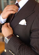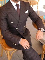 The Troy Street double-breasted suit is a commanding blend of classic authority and modern refinement. Tailored from a rich dark chocolate brown pinstripe fabric, it offers a powerful silhouette elevated by signature gold metal buttons, creating a look that balances timeless elegance with unmistakable presence.