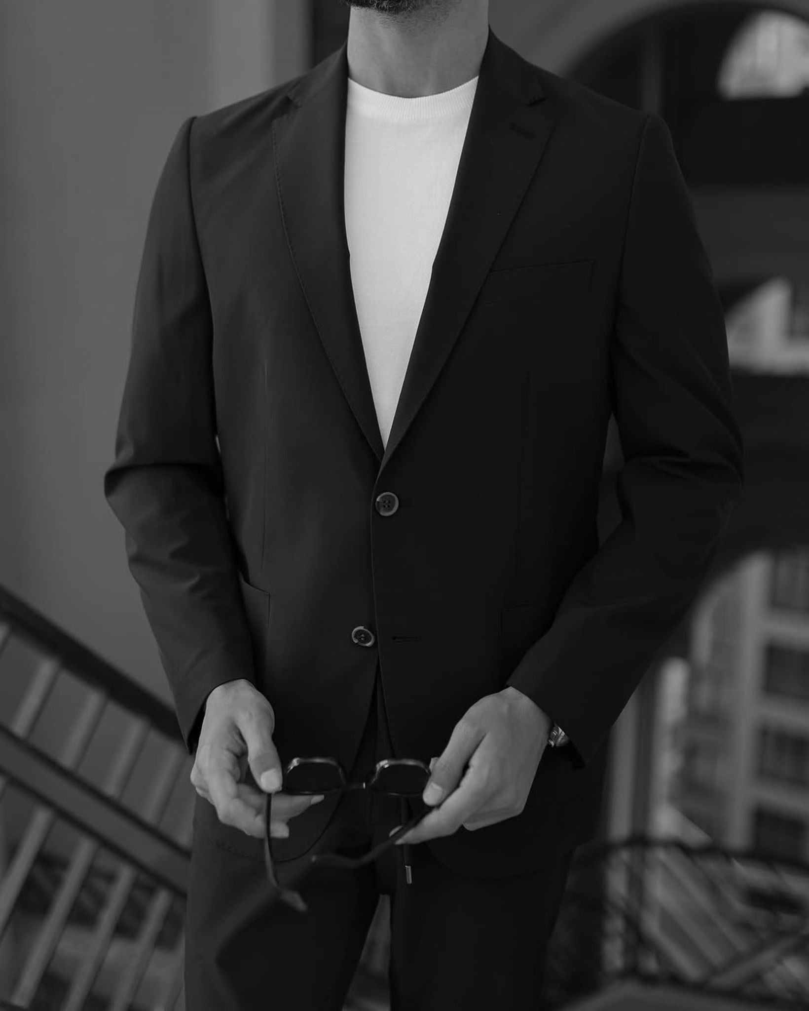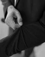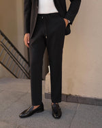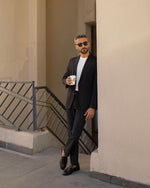A tailored slim-fit black men’s two-piece suit with peak lapels is a sophisticated and stylish choice for formal occasions. The black colour, a light beige or off-white shade, adds an elegant touch to the ensemble. The slim fit of the suit creates a sleek and streamlined silhouette, exuding a modern and fashionable look. The peak lapels on the jacket add a touch of flair and formality, elevating the overall aesthetic.