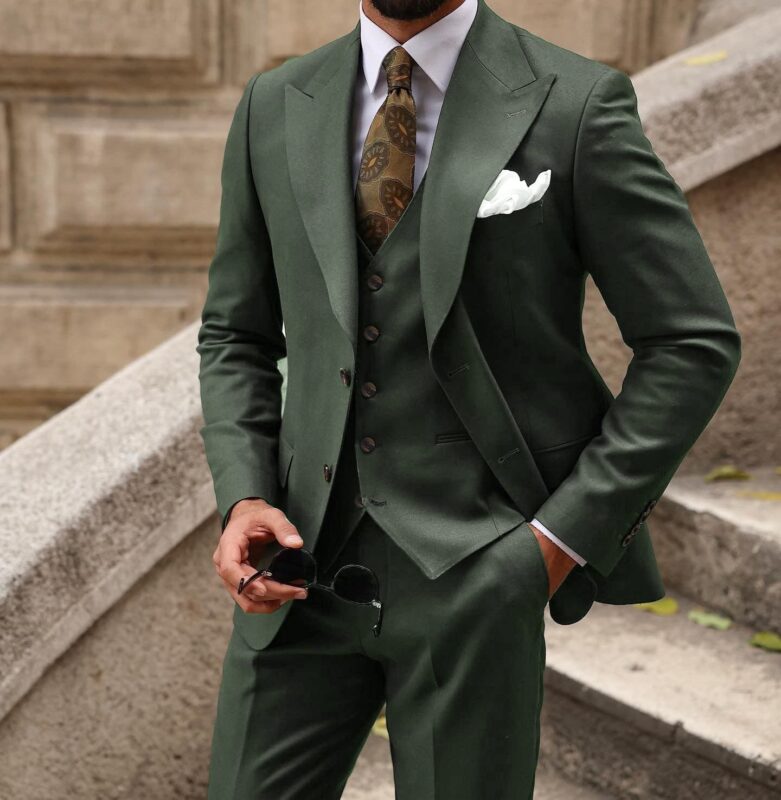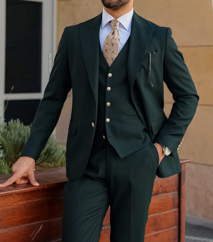 Step into style and sophistication with the pine green men’s three piece suit! This slim fit suit features a sleek and modern cut that hugs the body in all the...